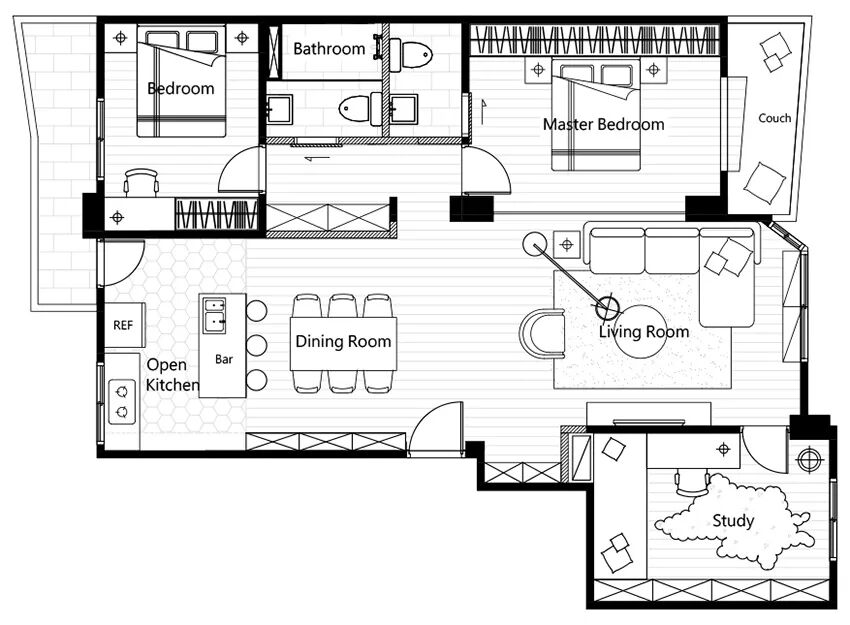 需求:改善采光与狭长格局,希望卧室中要有活泼元素。
