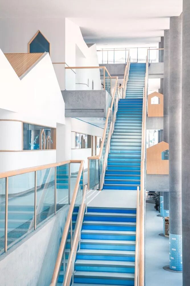 连接着每一层的渐变蓝色大楼梯,与周围的混凝土柱子和原木色楼梯扶手相搭,在朴素的背景下显得格外醒目,为整个4层楼的空间增添了活力。