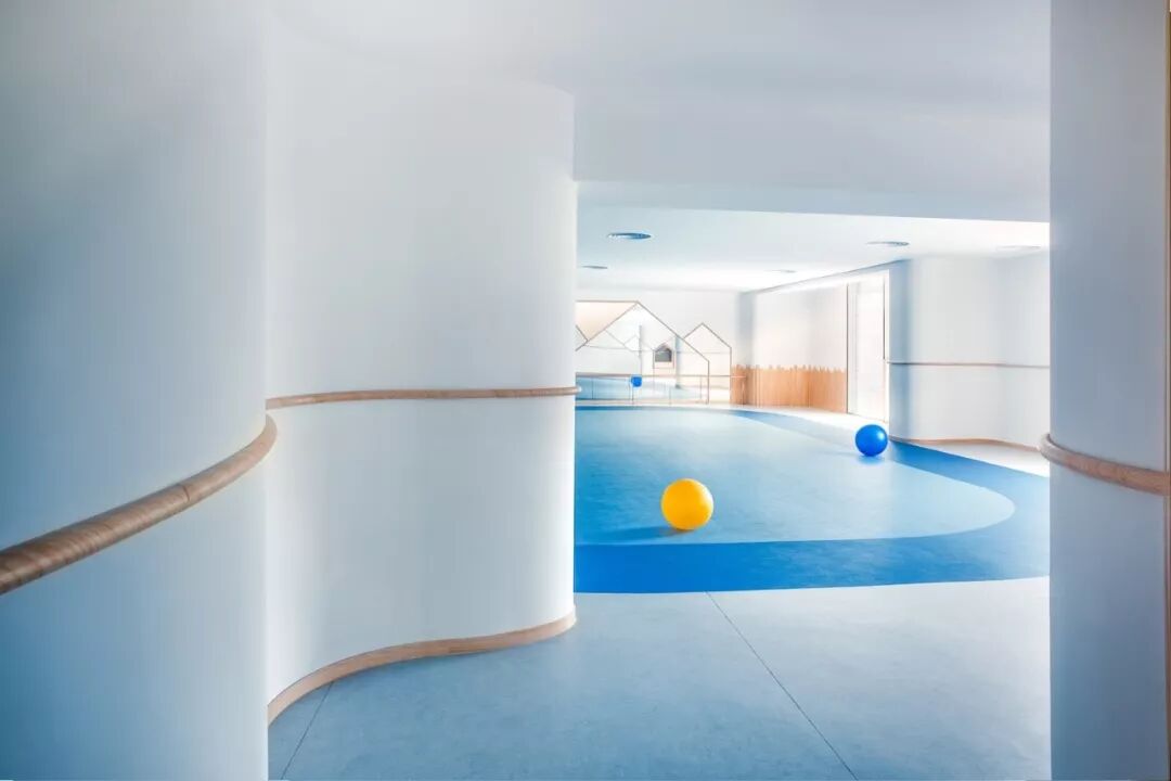 地面利用色彩来突出空间的活跃氛围,它更像是一个圆形的小操场,孩子们在这里能够自由自在地奔跑玩耍。