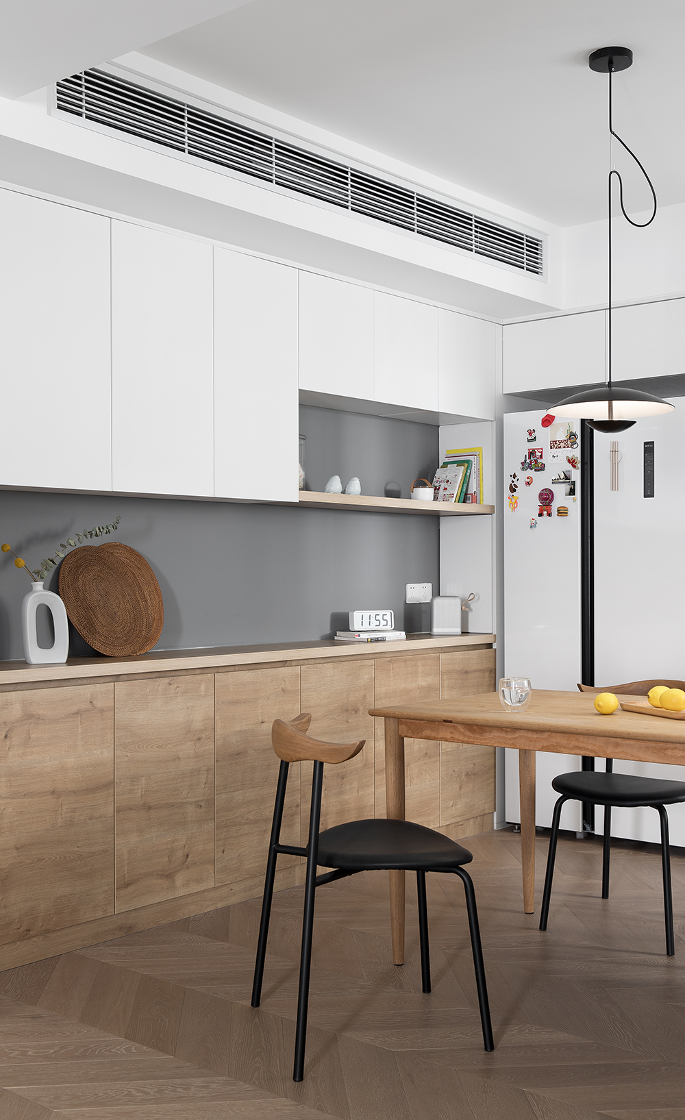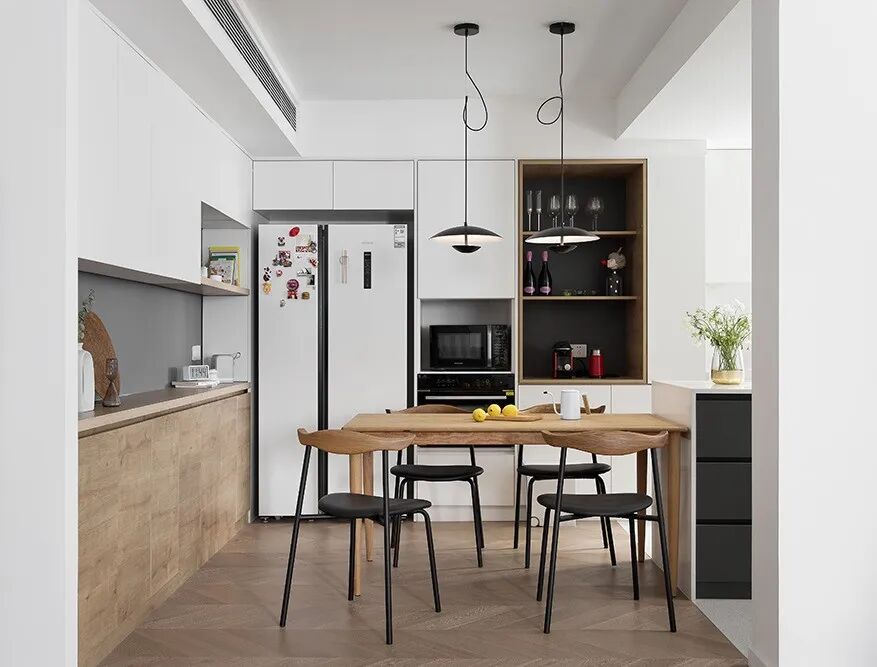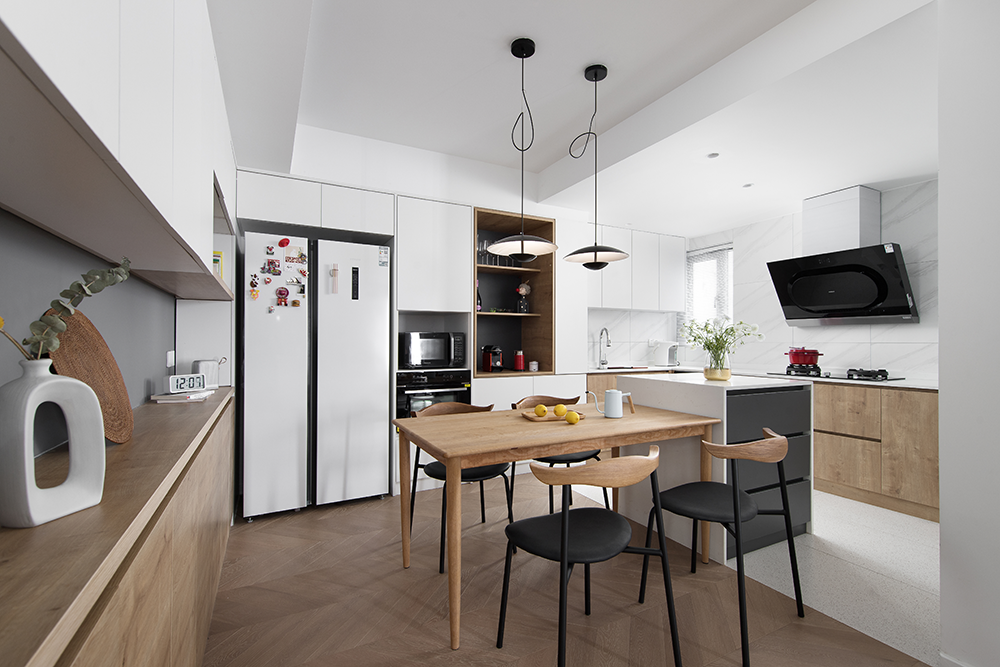 将餐厅与厨房的墙面打通,并将生活阳台进行了封窗,巧妙的将开放式厨房与西厨与餐厅融合在一起,还是那么舒适。