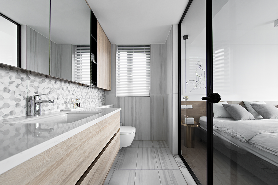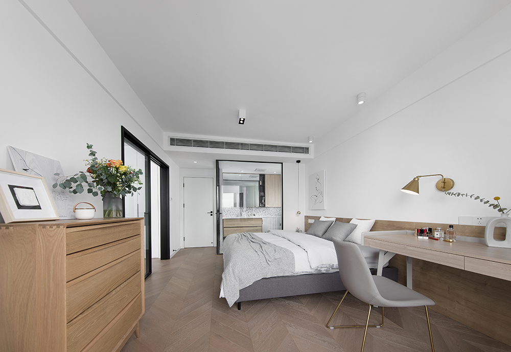 从进卧室开始,不管是主卫还是衣帽间,用的都是黑框玻璃隔断将空间进行划分,所以视觉空间更有通透感,视线从卧室直至延伸到卫生间,卫生间的采光得到了很大的提升。