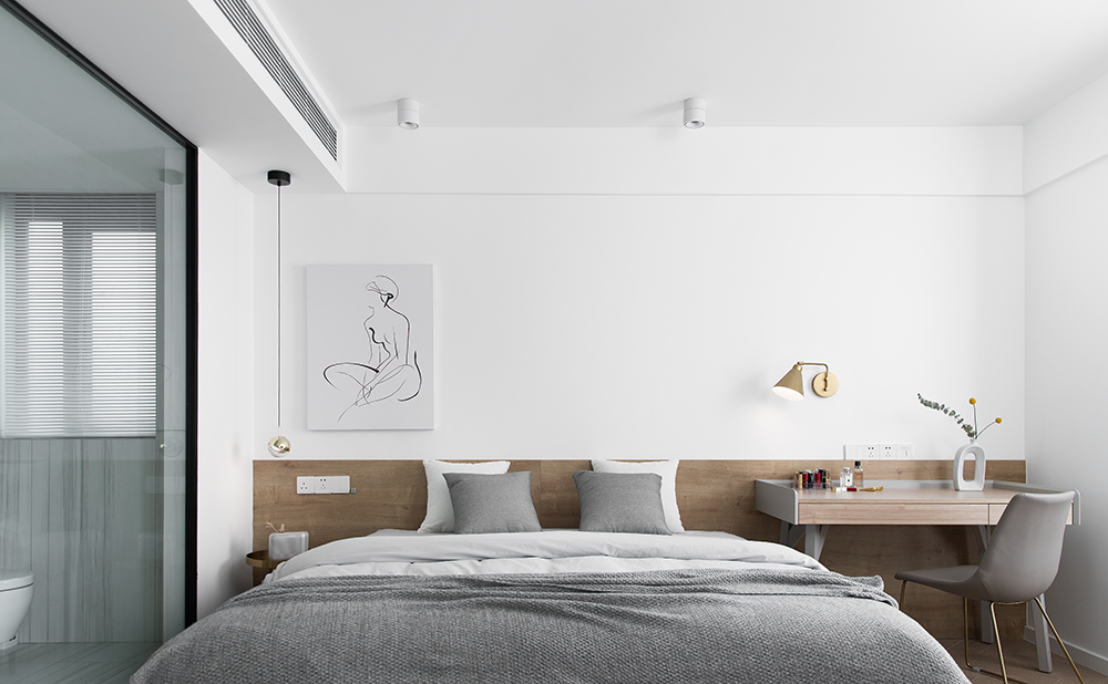 卧室的设计延续空间的整体风格,以简约线条为基调,纯白搭配原木打造宁静雅致的休憩空间体验。