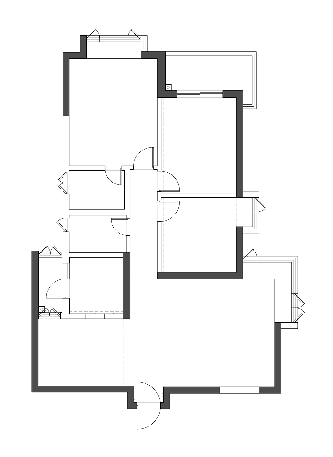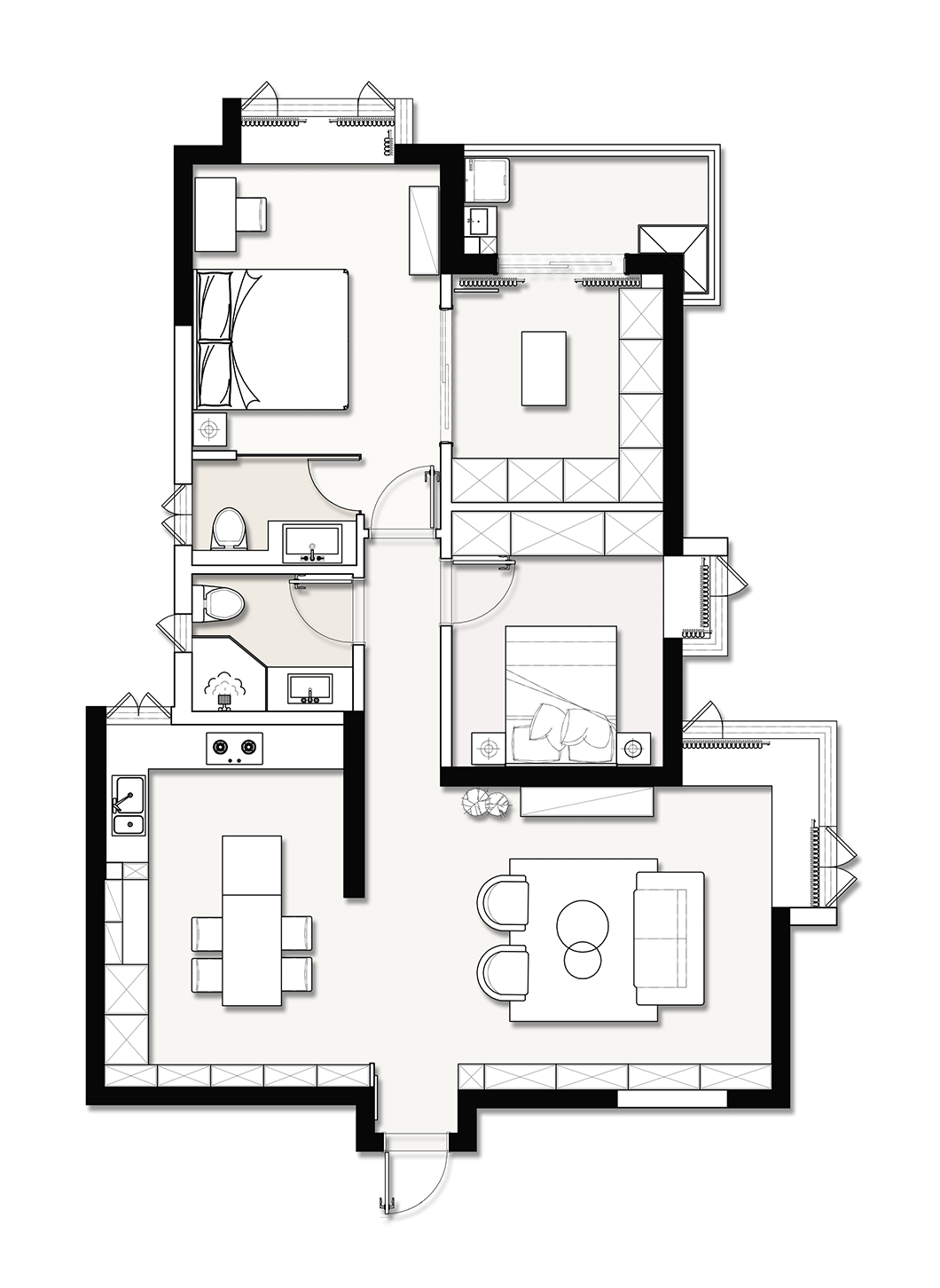基于层高这套房子不管是采光还是通风都还是不错的,但由于布局的问题,一部分动线并不合理,尤其是餐厅与厨房拥挤又昏暗。由于收纳不够用,所有生活物品衣物暴露在外面,显得尤为凌乱。