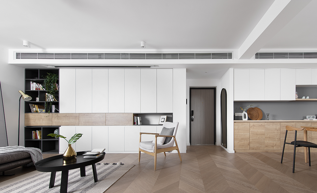 舍弃了电视墙,以投影幕布代替。一整面的无把手柜门,线条明了的一门到顶储物柜,增加很多的储物功能,视觉又简洁干净且提升家的高级感。