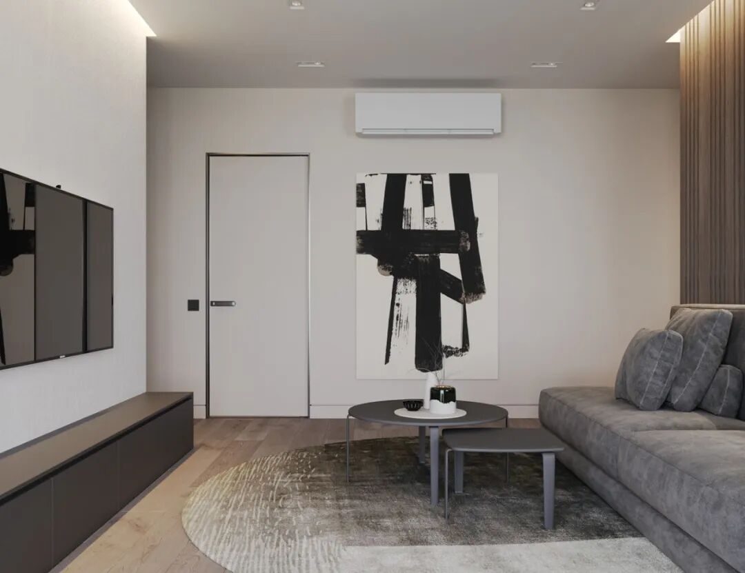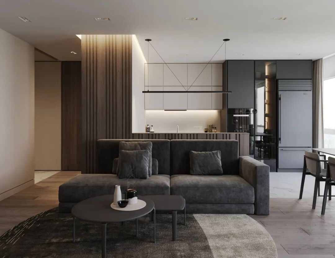 铺设,灰色的沙发,简约的茶几,透过米白色调揉合羽毛灰,赋予空间轻盈柔软质地