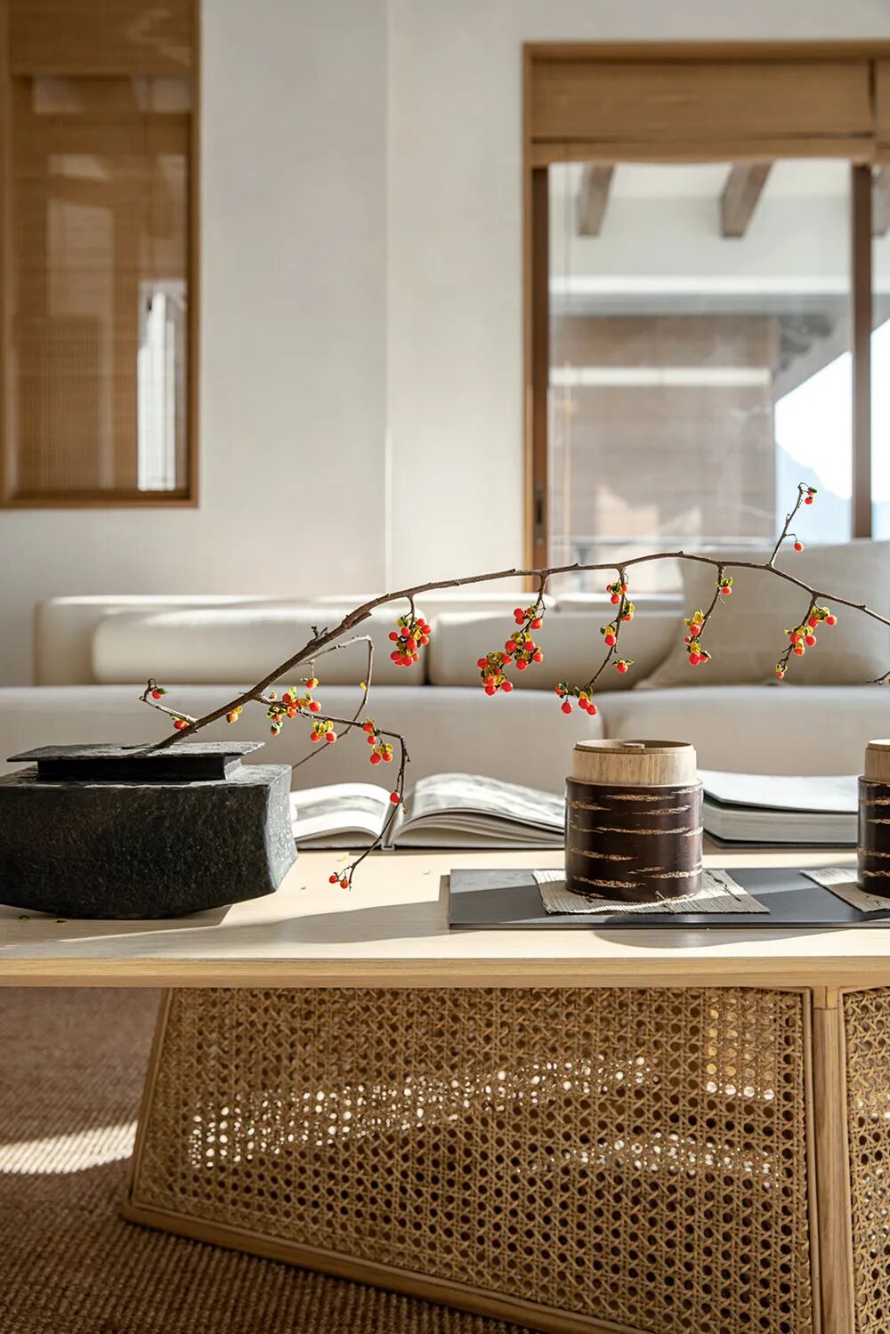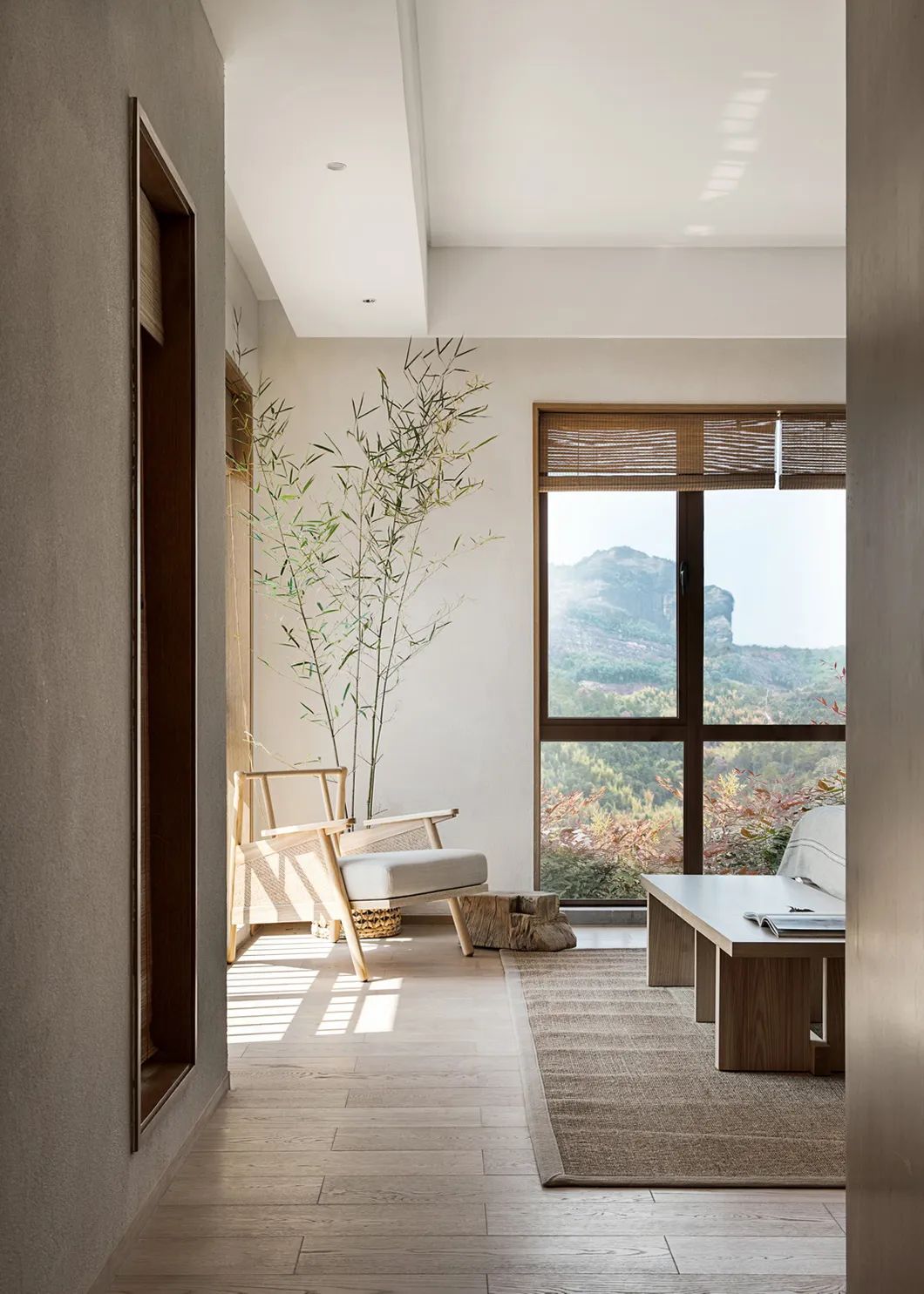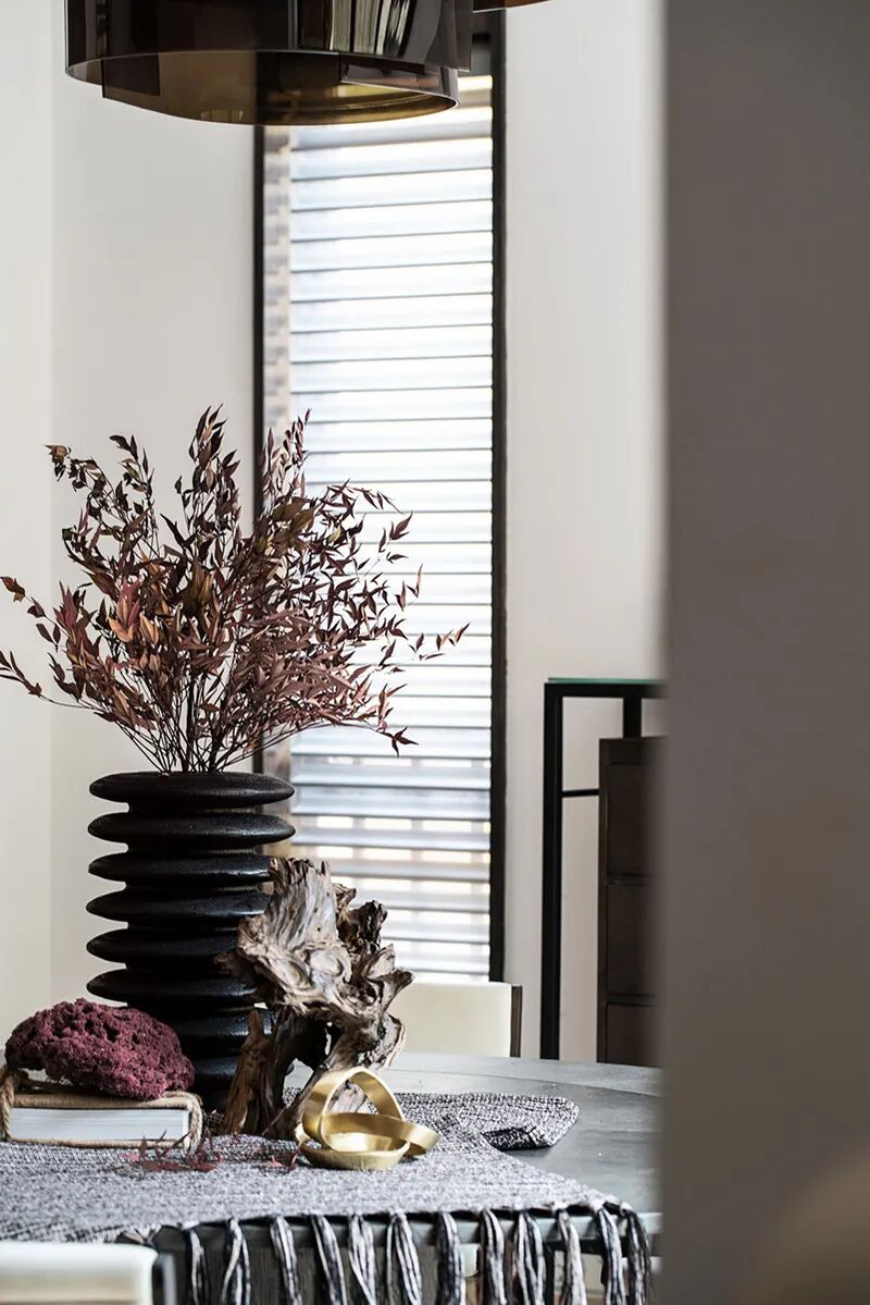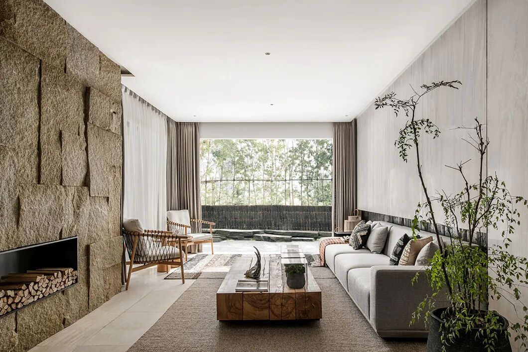 向山开窗,在这一方观云之境中,纵享水光山色沉淀美景的轮换,等春来,待秋去,随意从山间拾取的一截赤阳子,不加修饰,随意散漫,也可以成为客厅一处端景。