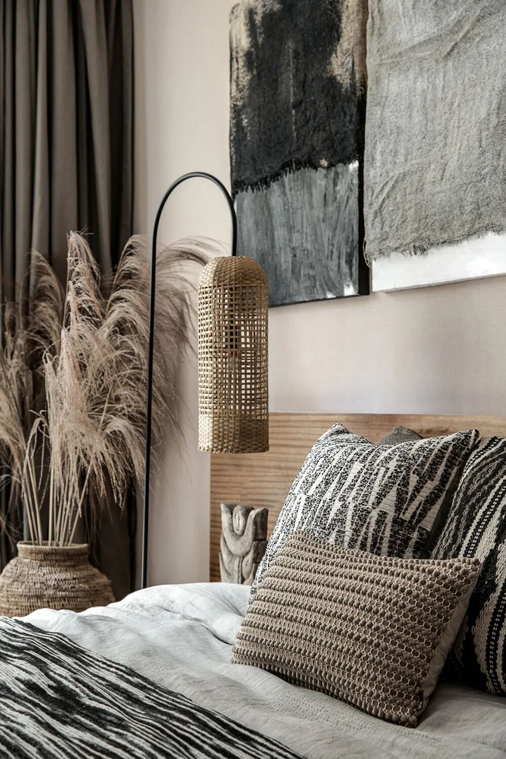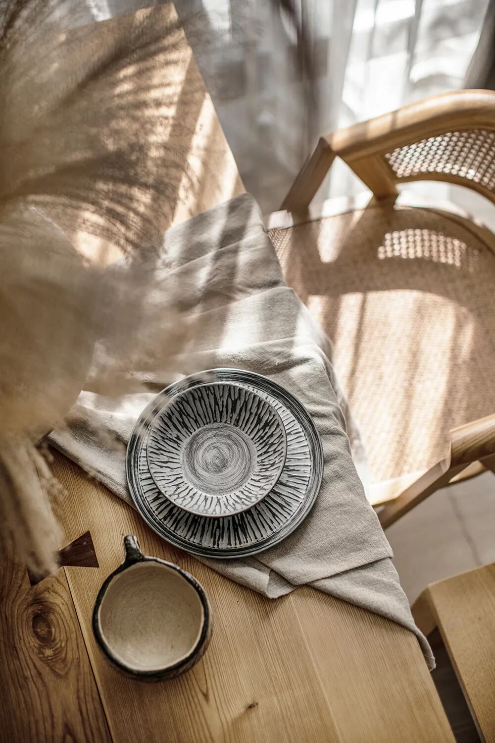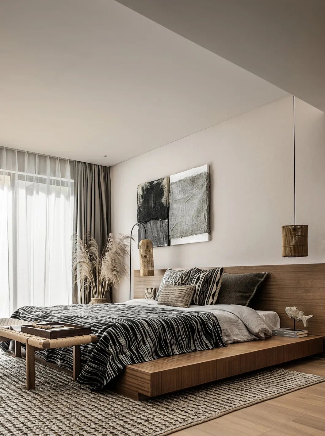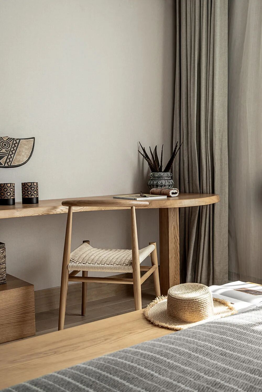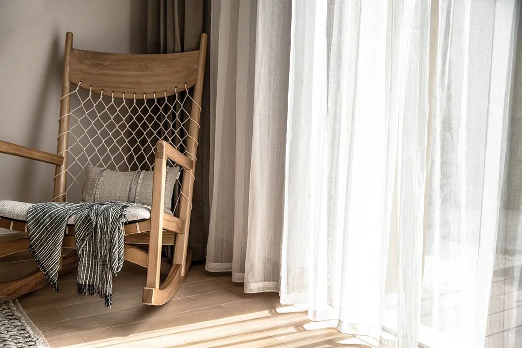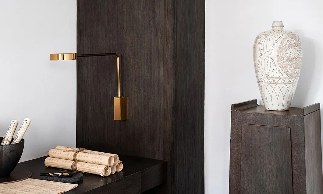 在家具乃至器物的选择上,用弧度取代棱角,线条简洁而平稳,尽可能地贴近地面。