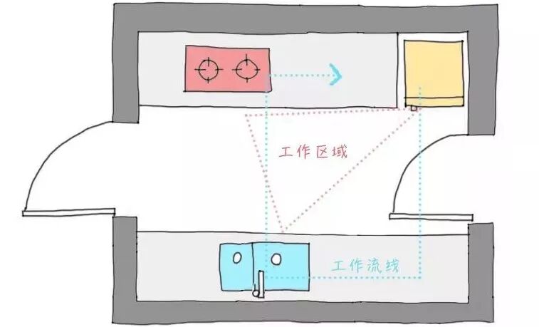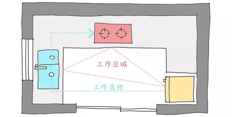 这里要记得一个叫做“工作三角”的知识点。从本质上来说理想的三角形布局(冰箱、范围、水槽)工作区最大化率,尽量减少在电器设备之间移动的时间和精力。