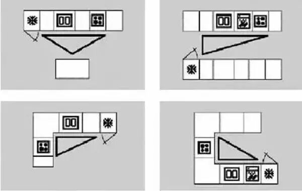 依据这三个区域可以设计规划出四种橱柜布局形式,每一种设计都是根据人们的行为习惯,实际应用和操作方便性考虑的。