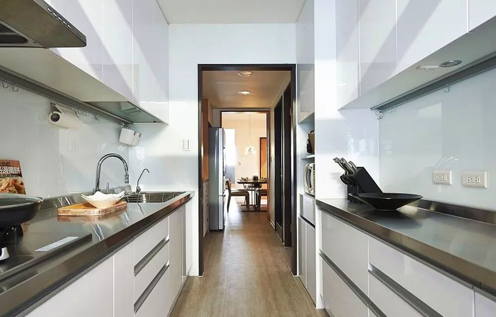 直线式的结构简单明了,节省空间,只要按照自己的使用习惯,将烹饪、料理、清洗区由左至右或是由右向左依次摆放开来就可以了。
