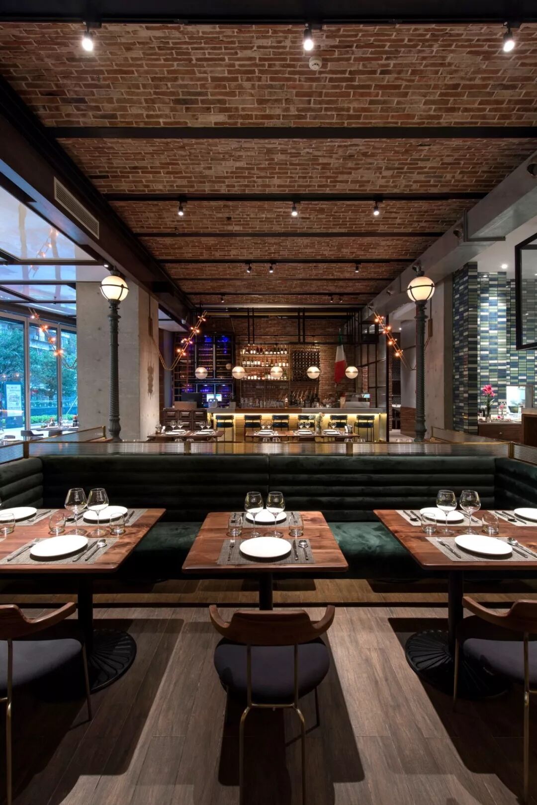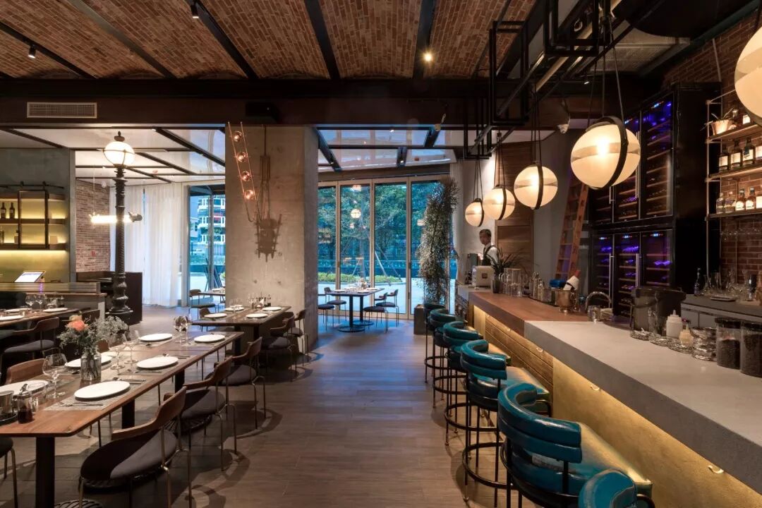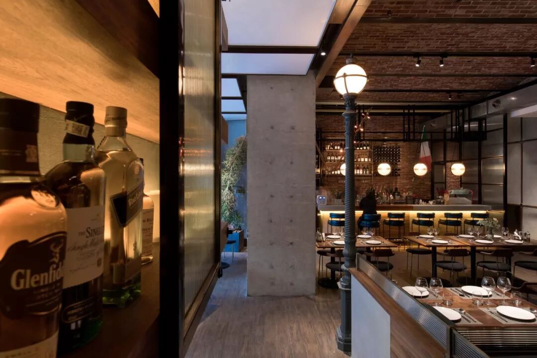 ▲拱形砖砌天花板、铸铁灯柱、红砖及水泥墙面、古朴的木地板等工业风元素营造出复古的时代感。在此基础上加入了地中海风格的手工砖、宝石绿的绒面沙发座、各种铜制的金属架及隔断使原始粗犷的空间有了细节与质感,让感观有了一种舒适的平衡,让空间散发出独特的气质与味道。