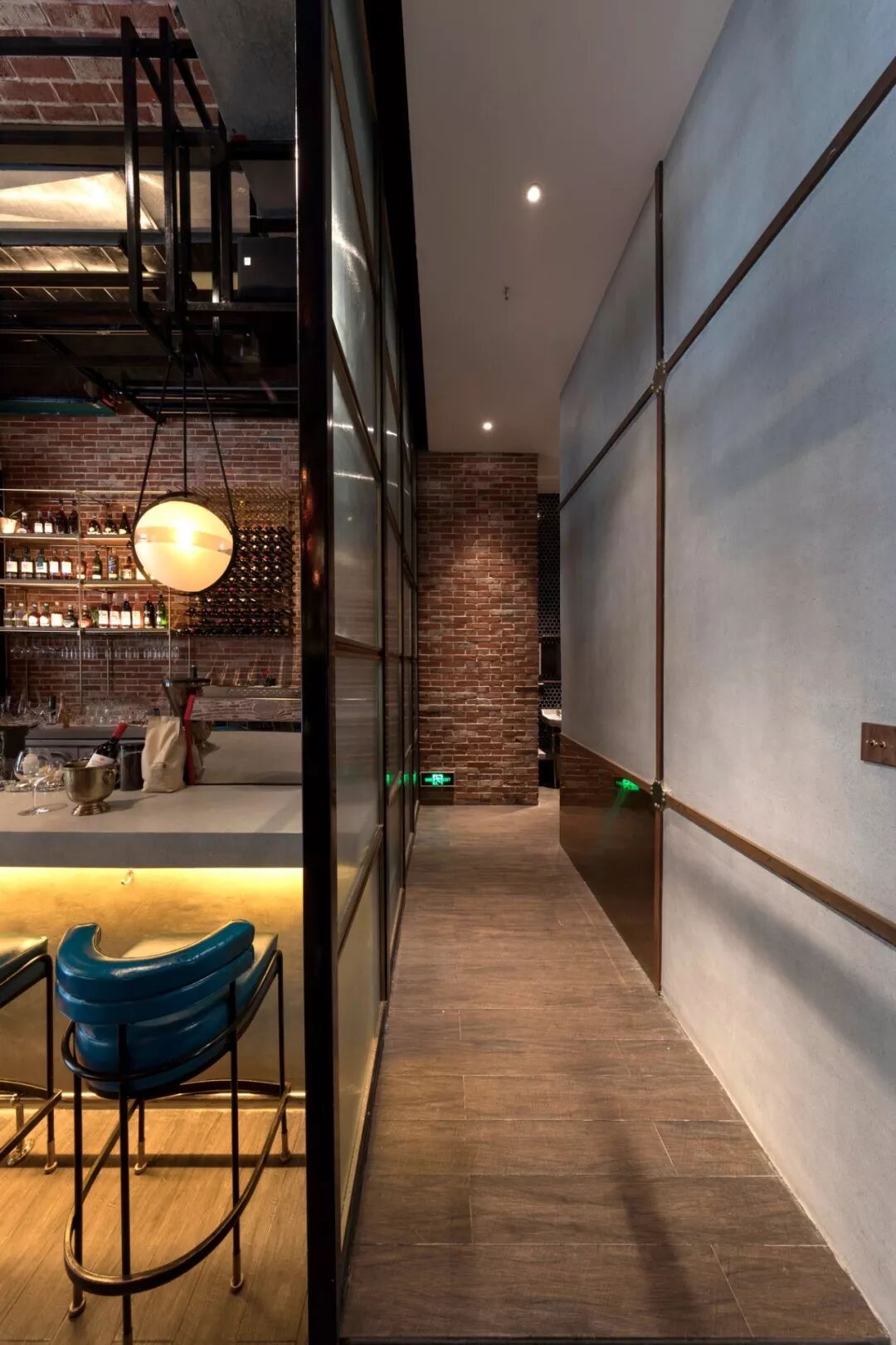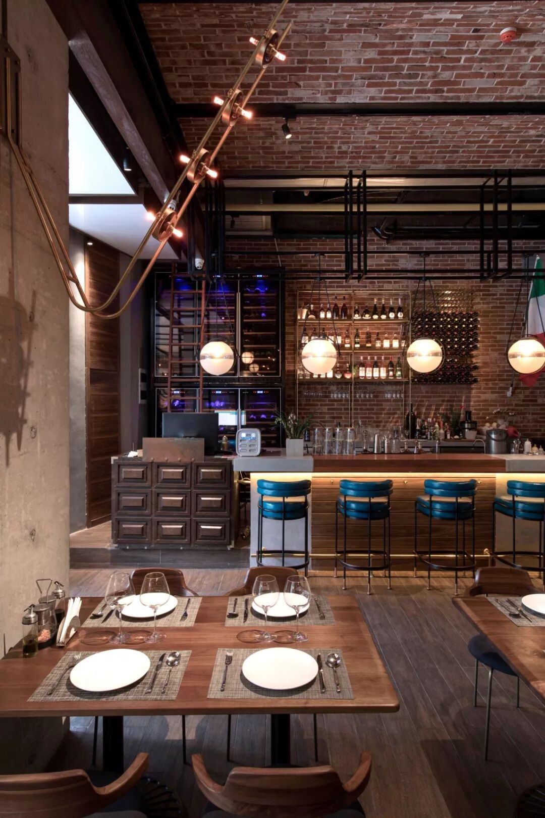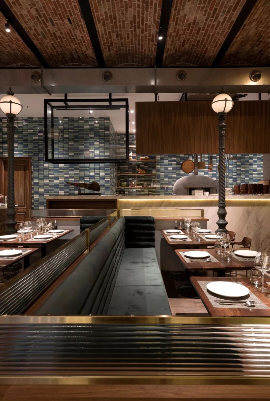 ▲拱形砖砌天花板、铸铁灯柱、红砖及水泥墙面、古朴的木地板等工业风元素营造出复古的时代感。在此基础上加入了地中海风格的手工砖、宝石绿的绒面沙发座、各种铜制的金属架及隔断使原始粗犷的空间有了细节与质感,让感观有了一种舒适的平衡,让空间散发出独特的气质与味道。