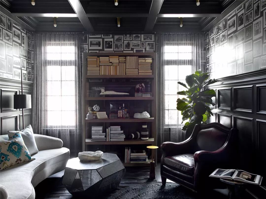 在阅读室中,设计师选用了黑白风格的“照片墙”墙纸,怀旧而复古。整个阅读室的色调偏暗黑,让人更易定神、思考。为避免沉闷,设计师加入了不规则的宝石复古镜面咖啡桌与亚麻色的异形沙发,不循规蹈矩,却是非常出彩。