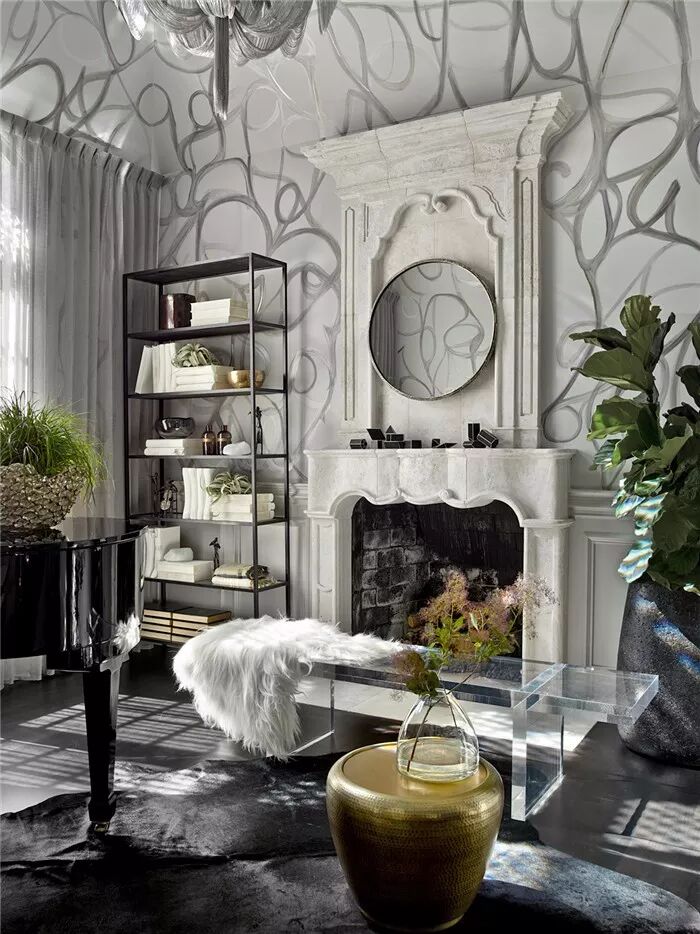 音乐室最大胆的元素就是抽象的金属线条墙绘,由芝加哥知名钢琴演奏家、艺术家Amanda Morrison亲自操刀,在浅灰色的优雅氛围中,抽象线条与高雅的ATLANTIS吊灯相互呼应。设计师保留了原来的壁炉设计,现代与传统在这里擦出了不一样的火花。