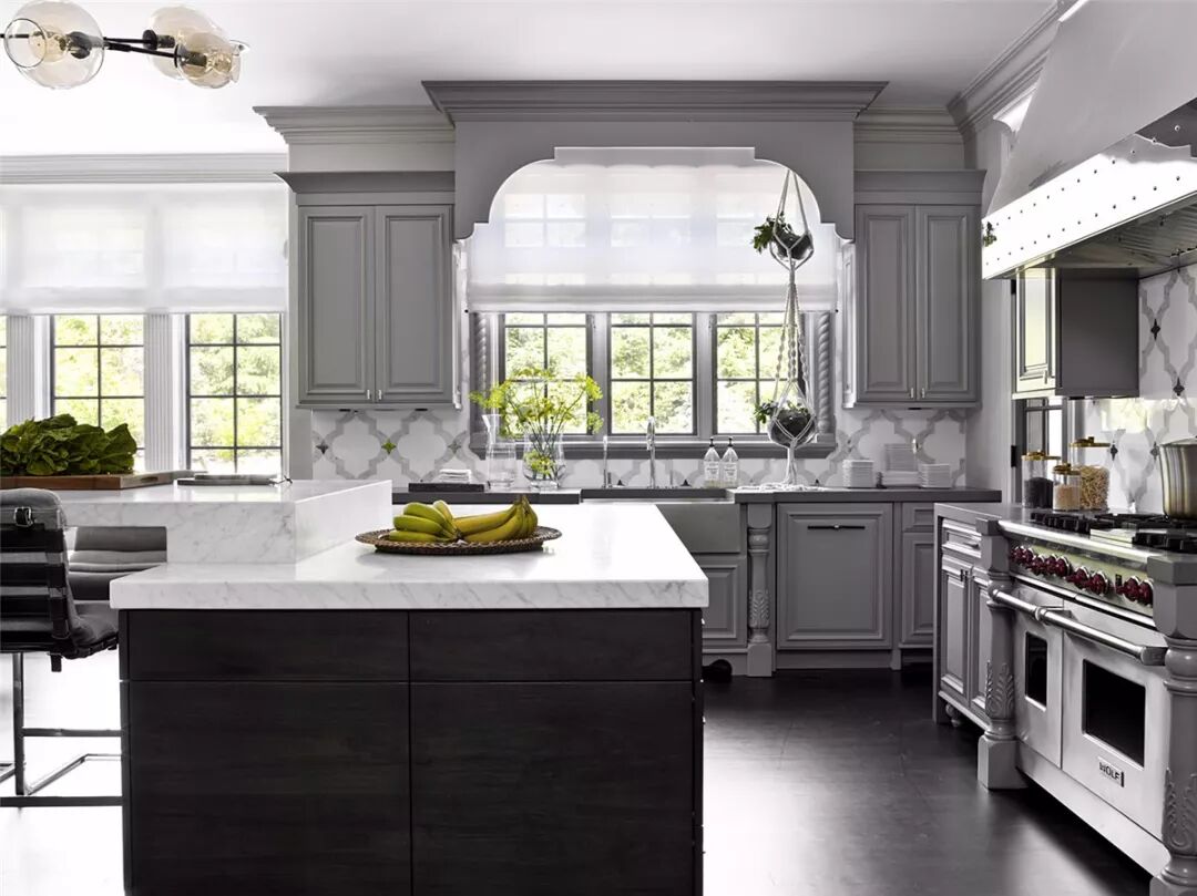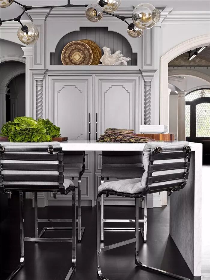 明亮而宽敞的厨房以优雅灰作为主色调,弱化了橱柜原本华丽的古典细节,突出了现代感。定制尺寸的摩洛哥风格墙面瓷砖消除了灰色空间可能带来的沉闷感。窗外郁郁葱葱的景色与室内生机勃勃的绿植,让人仿佛置身于大自然中。