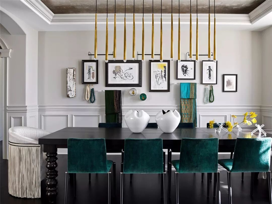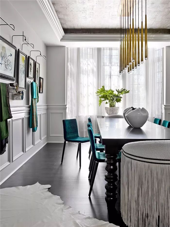 餐厅里最醒目的是Roche Bobois天鹅绒翡翠绿餐椅,亦蓝亦绿的色彩特质带来异域的气息,并与餐厅一侧定制壁挂式装饰架上的异域风织物相呼应。原来,这是Sally Grimes的母亲赠送给她的礼物-宝石色调的纱丽。