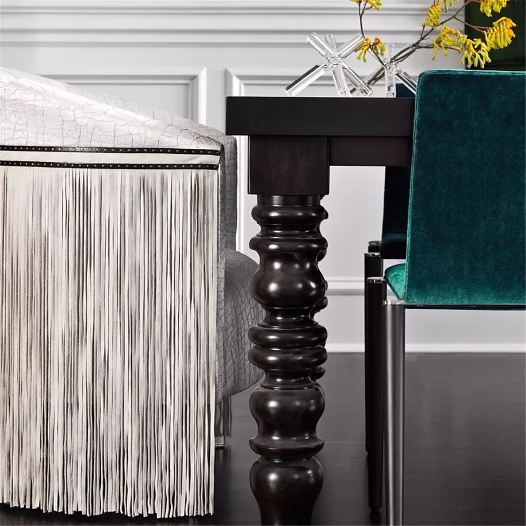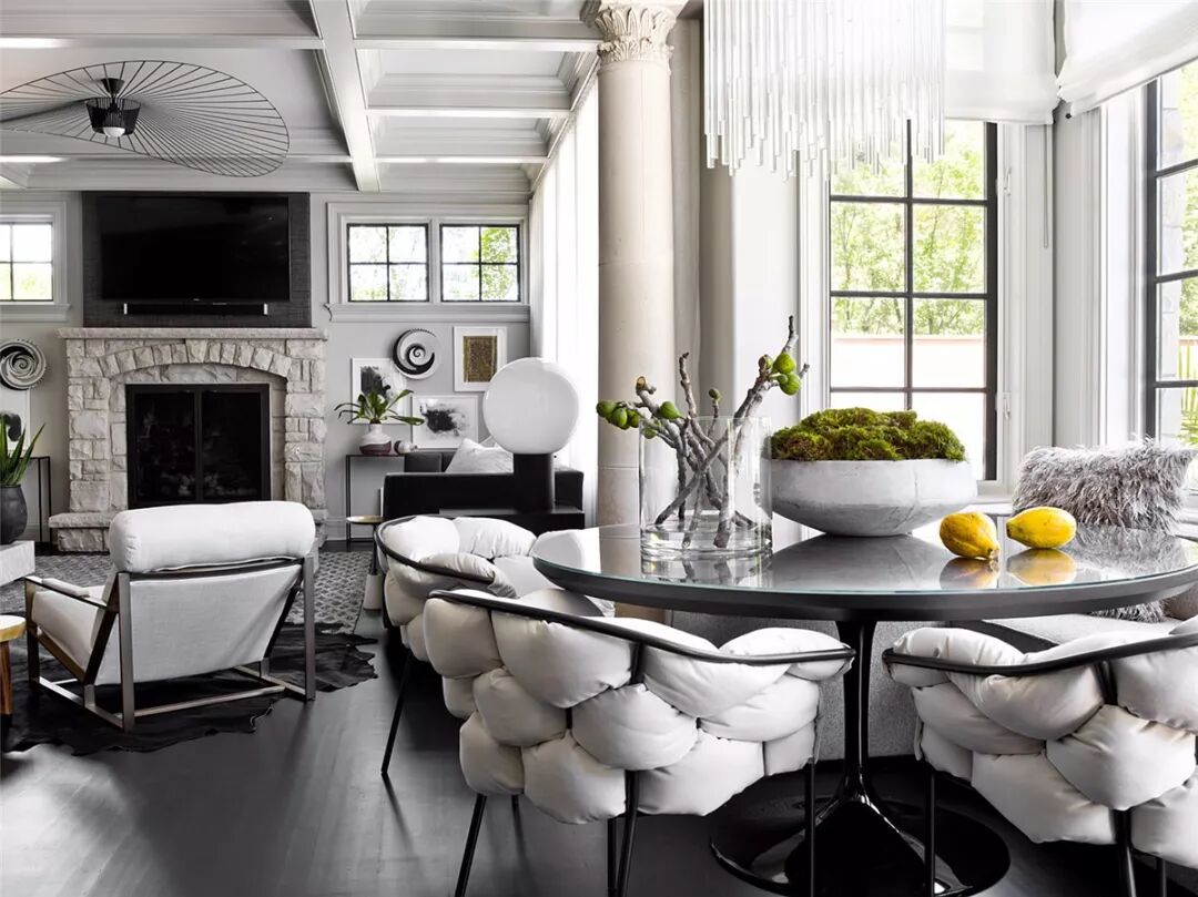 简约风格的餐厅设计加入了设计师的巧思,设计师保留了原来传统风格的黑色餐桌,增加了水晶、皮革、流苏等装饰元素,特别是主人椅的麂皮绒流苏让人联想到经典的机车夹克(尽管是白色的流苏),金属铆钉又带来了摇滚乐的氛围。“我们想要一些前卫和原创的设计”Sally Grimes说, “椅子看起来像是悬浮着的,简直太棒了!”