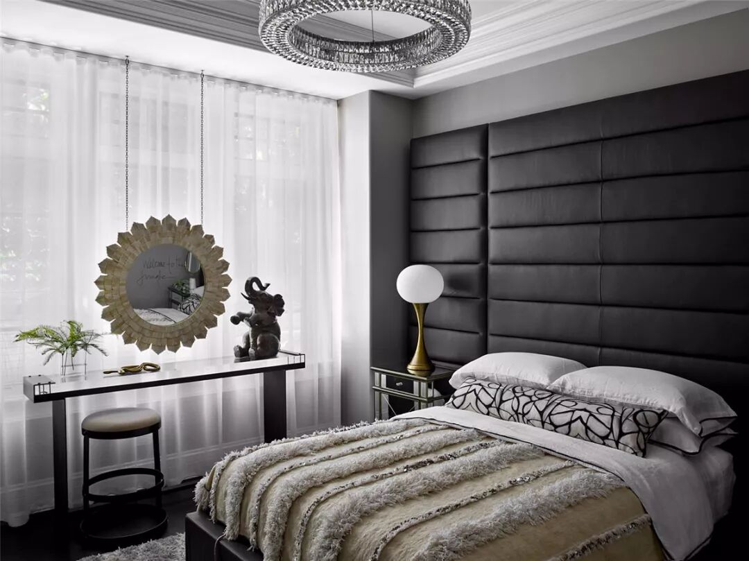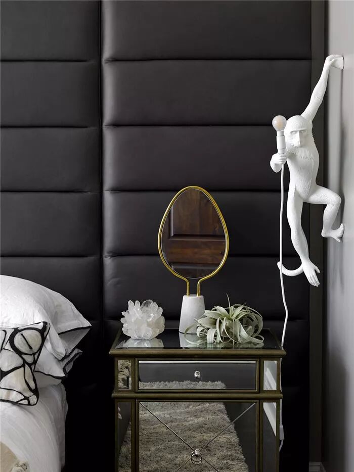 黑色的软包床头背景墙,白色的天花与窗纱,灰色的墙面-经典的黑白灰主卧室设计。传统亚麻色床品及风格大胆的摩洛哥亮片盖毯形成强烈的对比,镜面床头柜与水晶吊灯摩登而时尚,呆萌的大象摆件与Seletti猴子床头灯带来了丛林的气息与趣味元素。