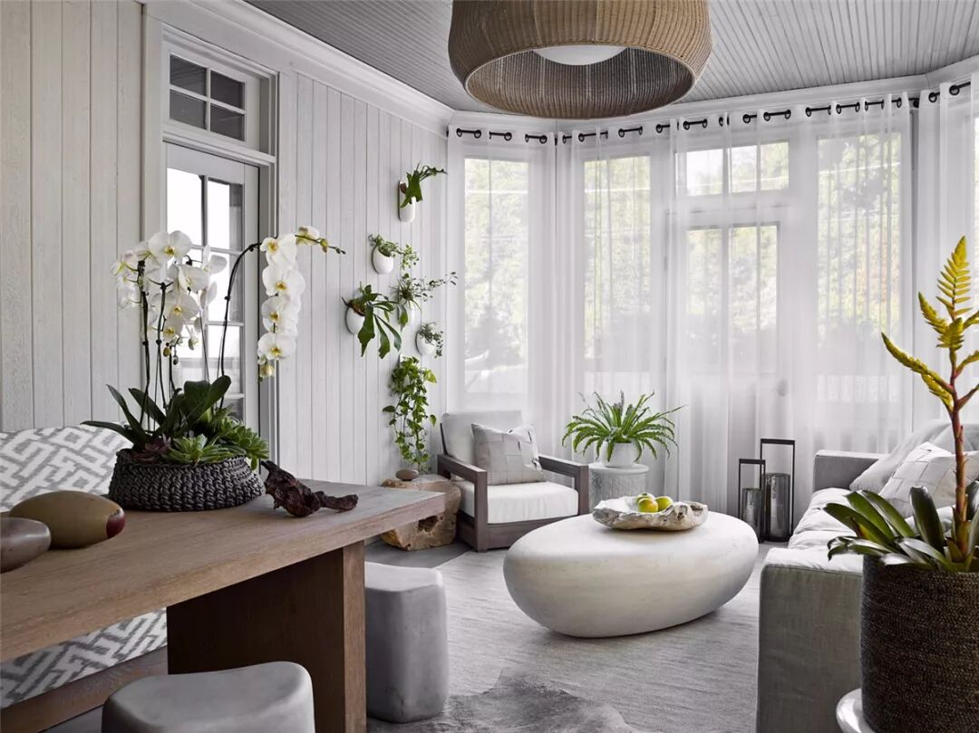 这是一个宁静、惬意的阳光房,也可以称之为冥想室。透明的白色窗帘也挡不住窗外大自然的馈赠,室内的绿植也是欣欣向荣之态。设计师在阳光房内集结了让人感到舒适、放松的自然元素,包括原木、原石、藤编、绿植等,家具织物也以亚麻材质为主。浅色调的原石凳子、咖啡桌与果盘,在这个空间一点也不显生硬,打磨过的线条让人感到舒适无比。