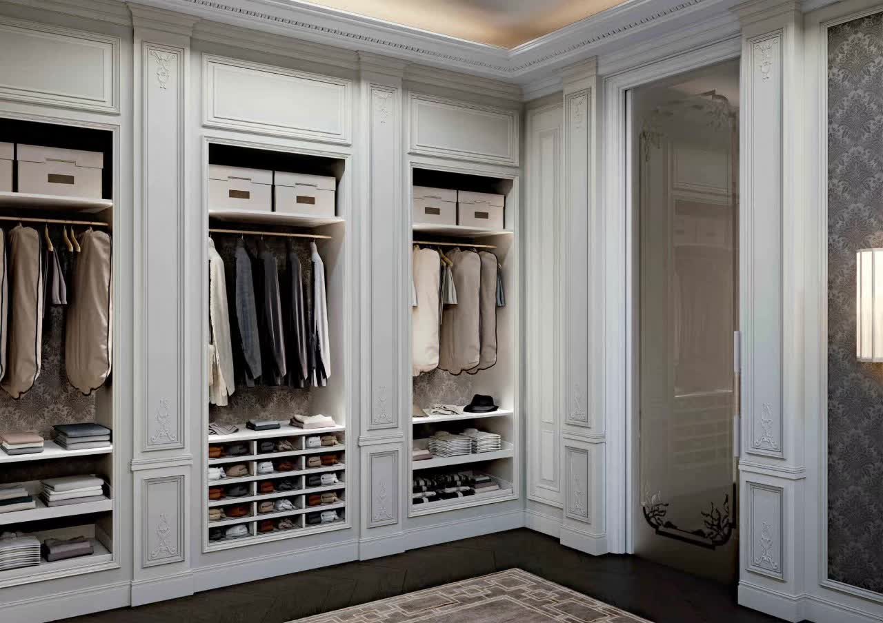 在新古典风格的家居中,常常会用到花纹壁纸。设计师将这一元素运用到了衣帽间与次卧中。衣帽间选用了高级灰花纹壁纸与白色主色搭配,次卧选用了灰调的格纹壁纸。