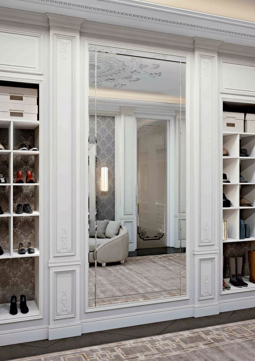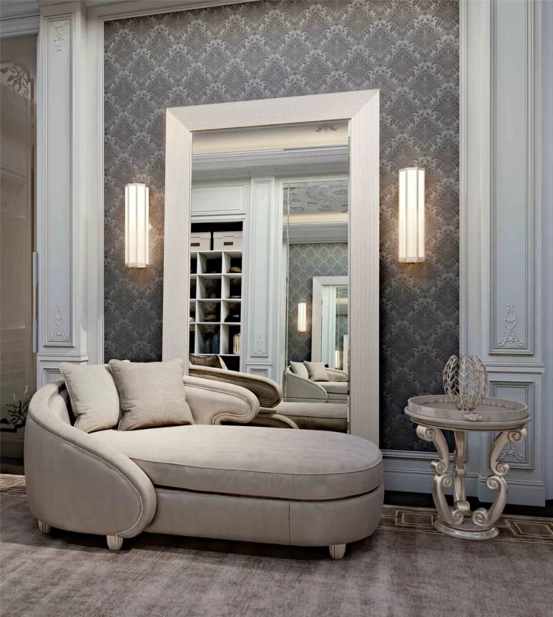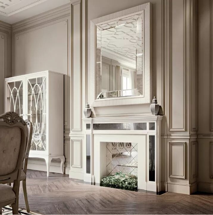 本案例中多处出现的镜面元素为空间增色不少,除了光线的流动,还带来了时尚的氛围。在一些新古典案例中,还会出现镜面玻璃顶面/天花或镜面装饰线的设计。镜面可以根据实际情况选用抛光或哑光的材质,抛光材质富有现代感,哑光材质又有复古的感觉,本案例同时在多处使用了两种材质的镜面玻璃。