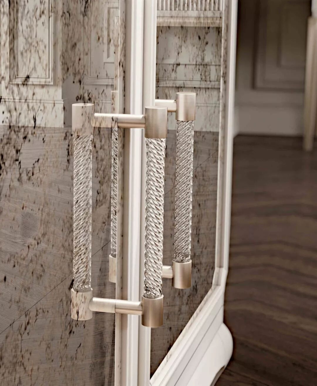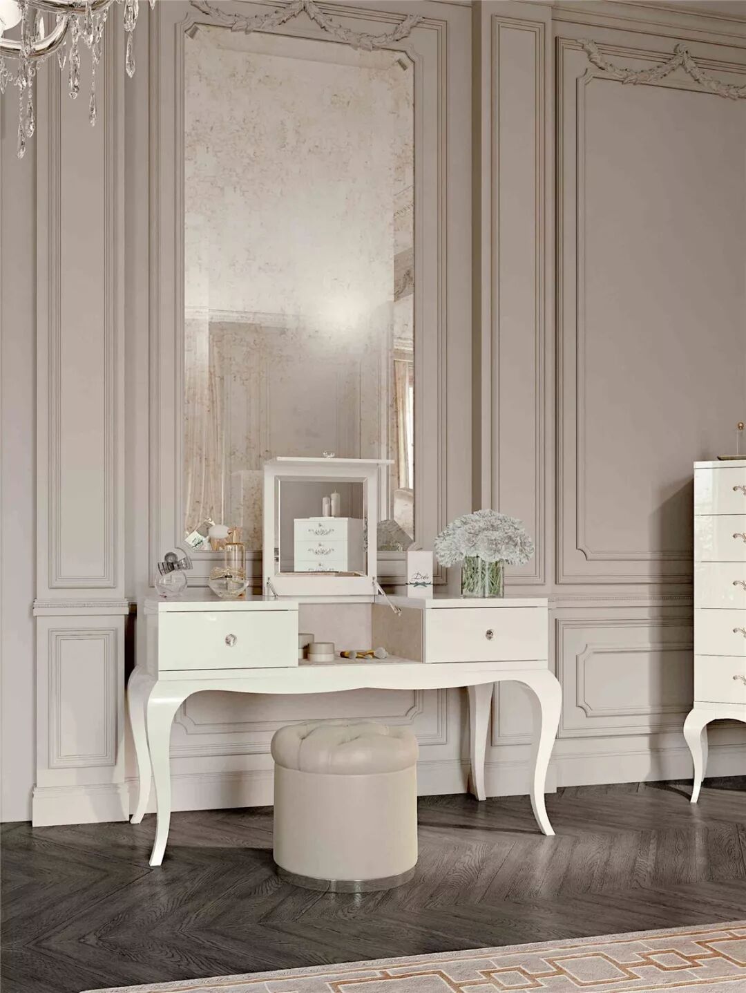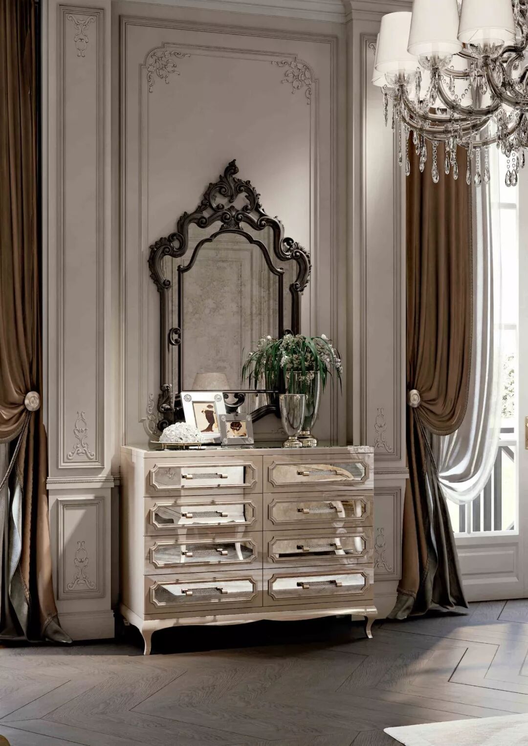 本案例中多处出现的镜面元素为空间增色不少,除了光线的流动,还带来了时尚的氛围。在一些新古典案例中,还会出现镜面玻璃顶面/天花或镜面装饰线的设计。镜面可以根据实际情况选用抛光或哑光的材质,抛光材质富有现代感,哑光材质又有复古的感觉,本案例同时在多处使用了两种材质的镜面玻璃。