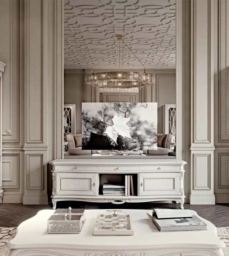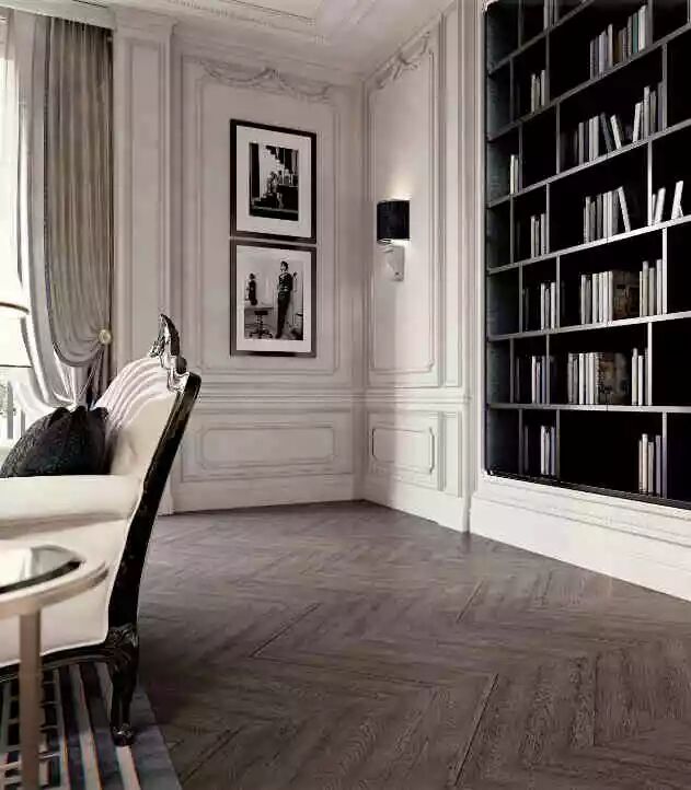 在挑高空间中使用新古典风格,简直就像“如鱼得水”般畅快,将其非凡的格调展露无遗。法式风格悄悄的在护墙板上绽放开来。