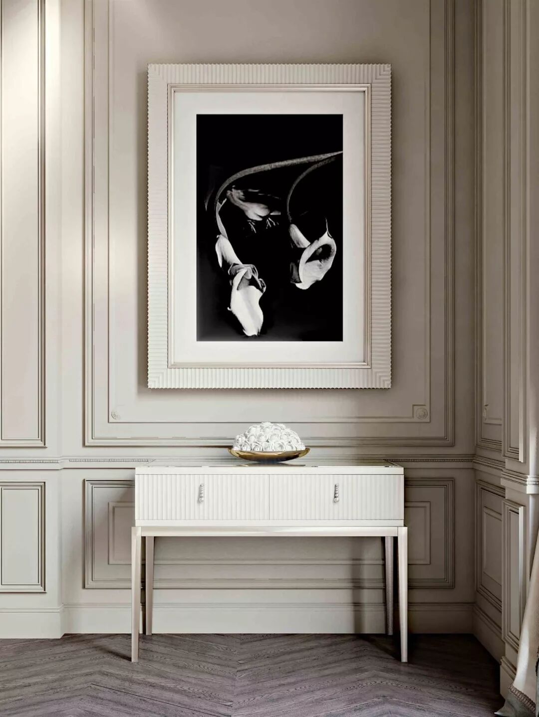 新古典风格非常讲究装饰的华美性,选择与整体风格一致的画框、花器、摆件等装饰品,能增强新古典的贵族气质。