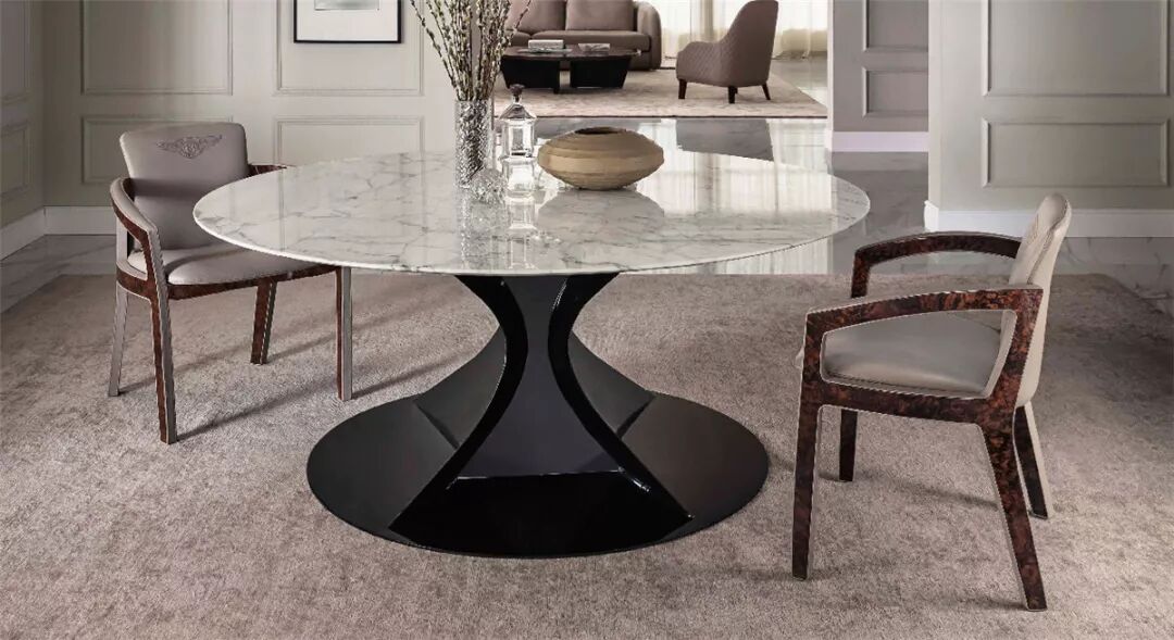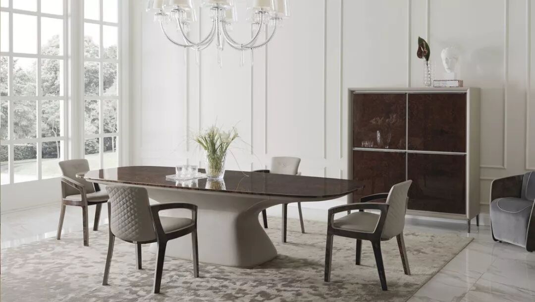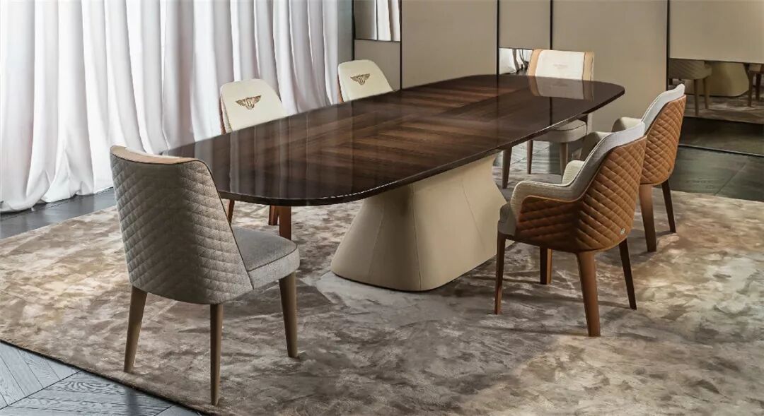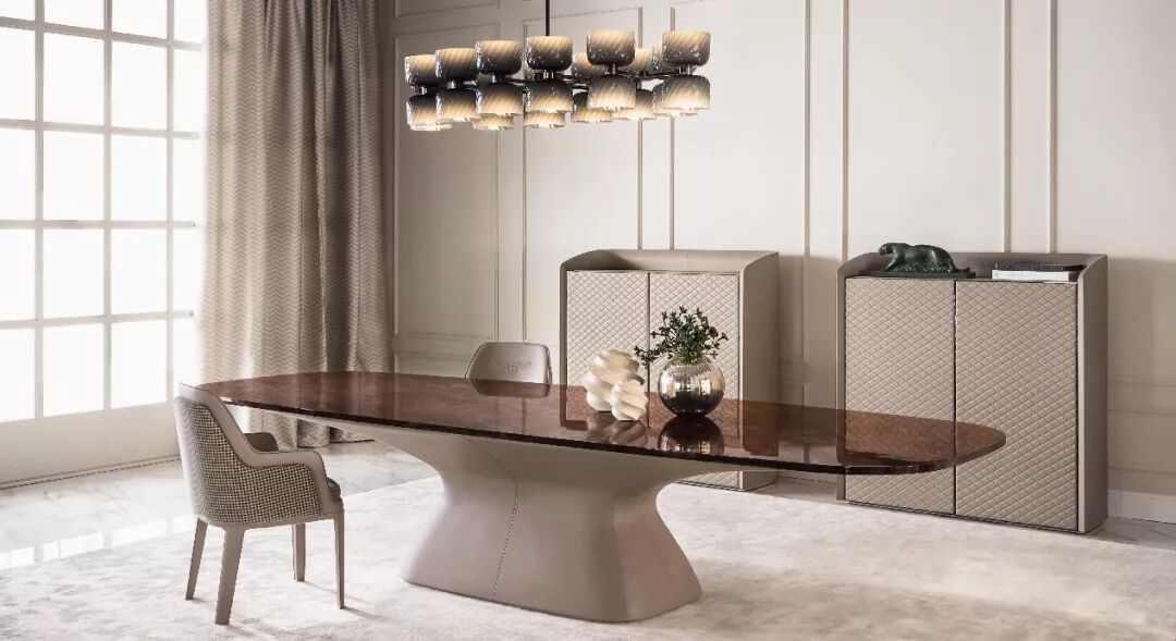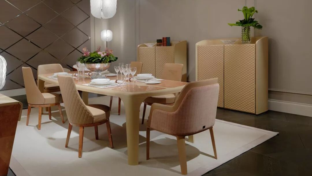 整个Bentley Home系列均采用高贵的材料制成,包括顶级的皮革、珍贵的丝绒、羊毛、大理石、黑檀木、精製钢材、稀有树瘤等,处处展现出家具的形体之美。工艺精湛的真皮饰面带有宾利品牌标志性的菱形格纹装饰,或饰以外观优雅的纺织衬垫,为系列家具更添一抹亮色。其餐厅系列家具的桌面擅长以天然的木纹展现大器气度,单椅椅背、椅垫均以皮革或织物包覆,带来细腻温暖的触感。