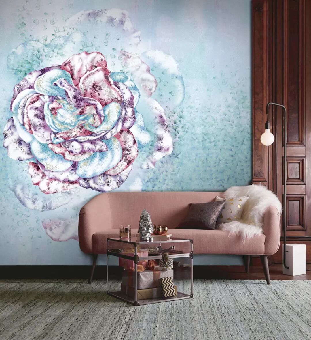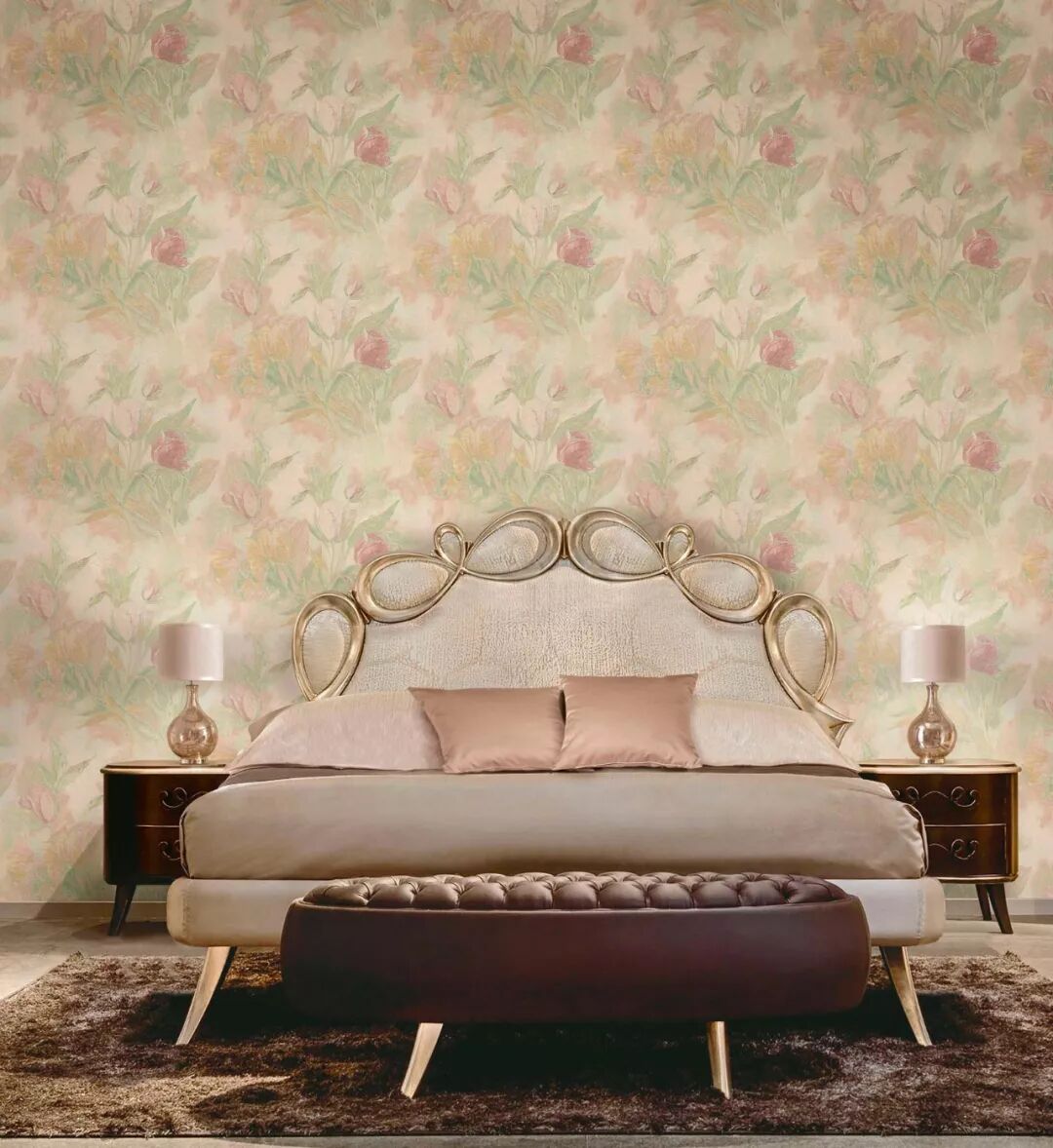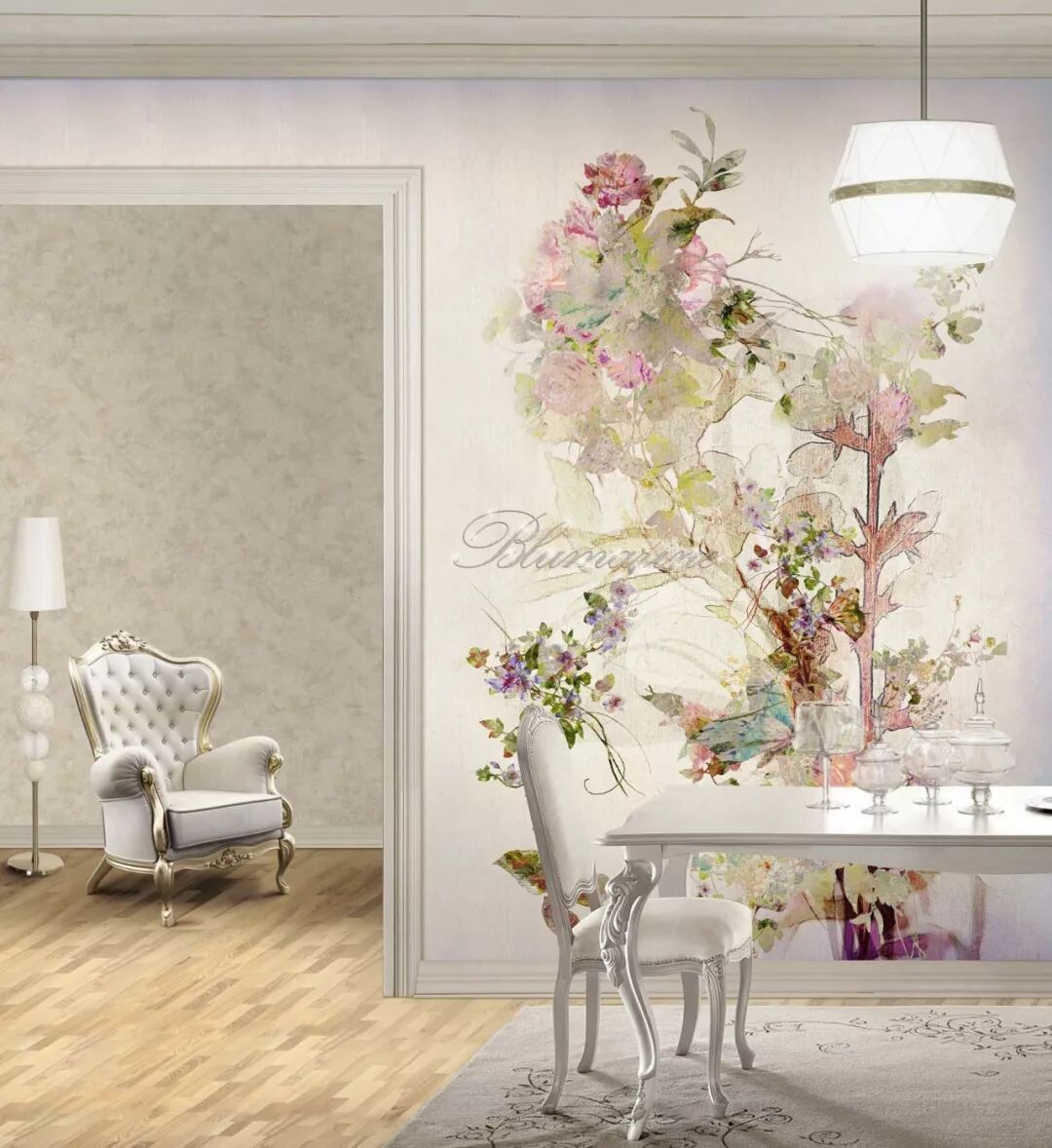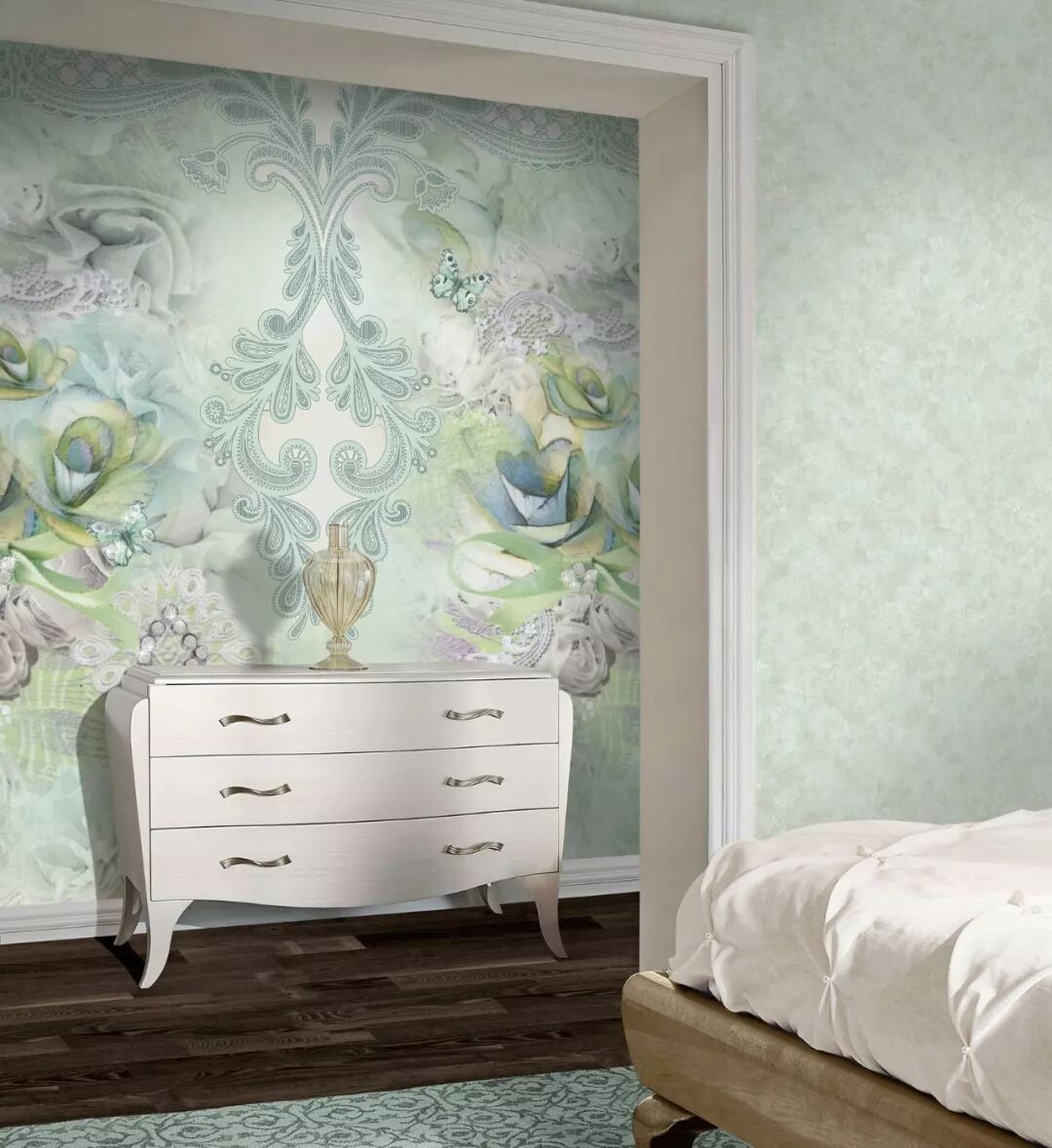 优雅的色调、柔和的花束、珍贵的树叶、丰富的刺绣在墙上绘制出迷人的风景。