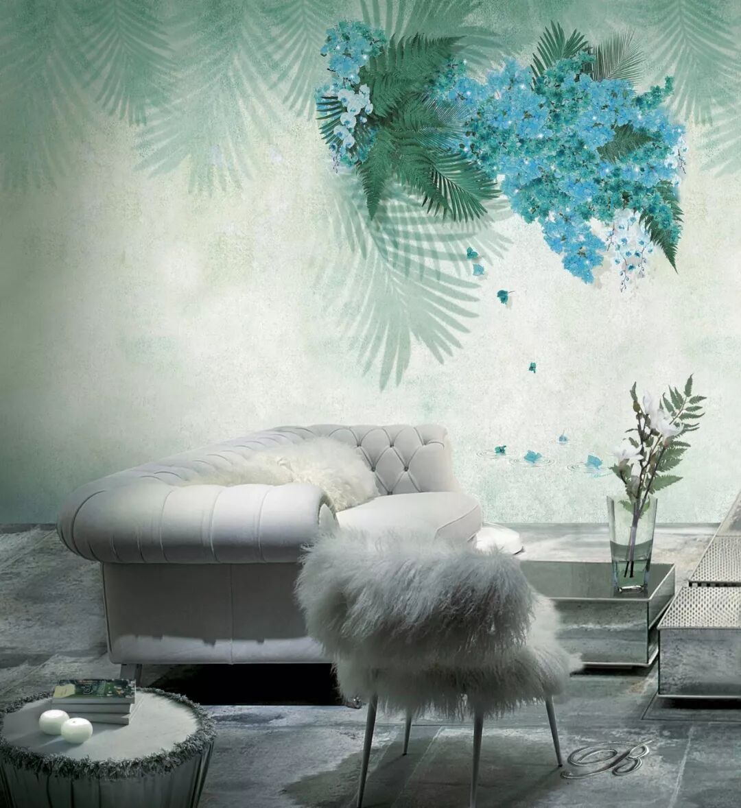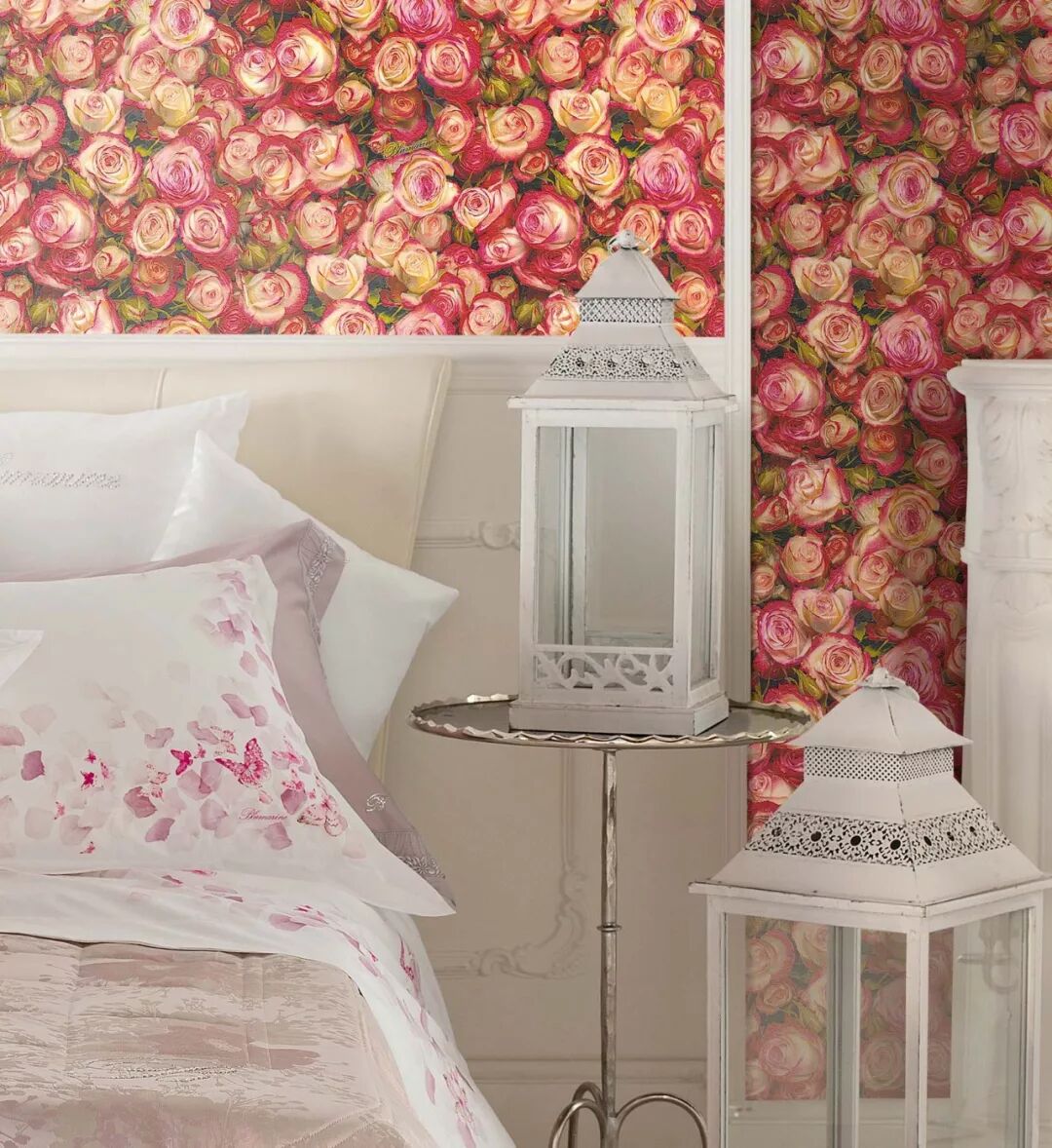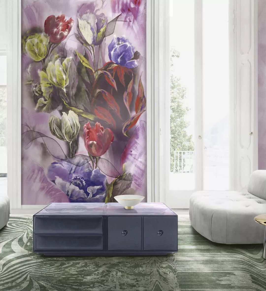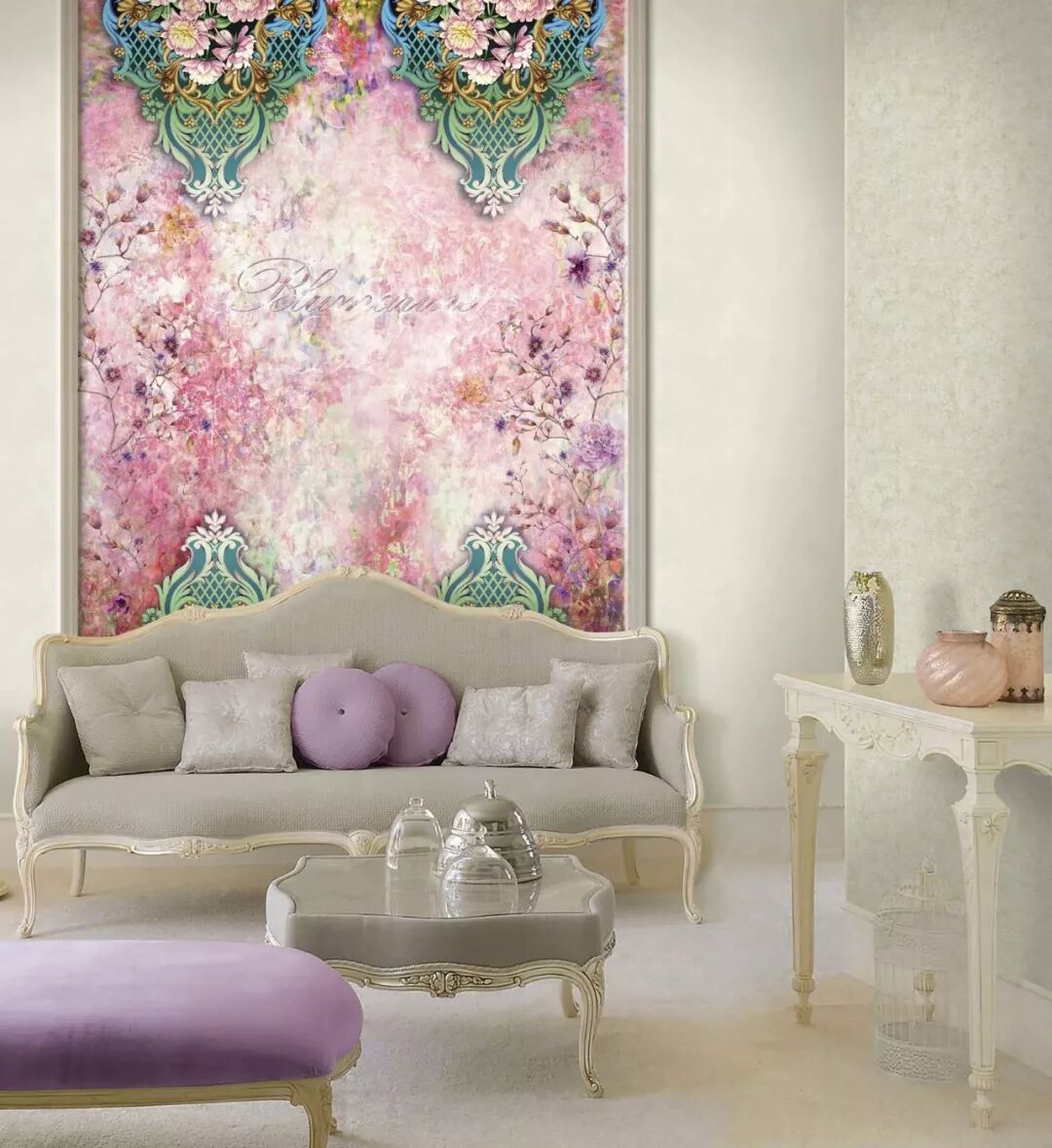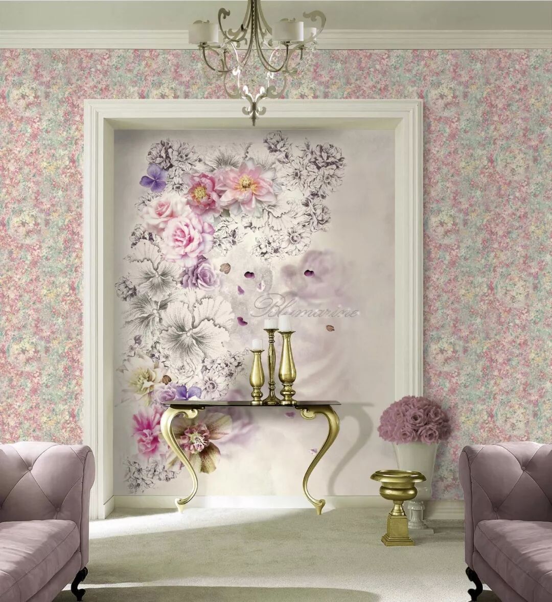优雅的色调、柔和的花束、珍贵的树叶、丰富的刺绣在墙上绘制出迷人的风景。
