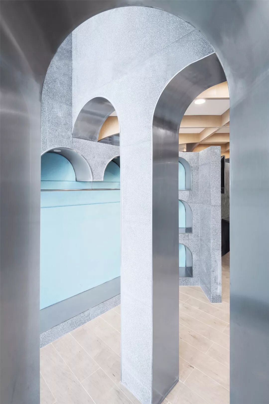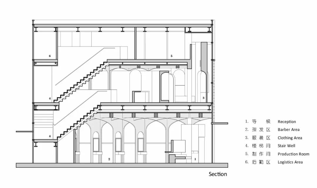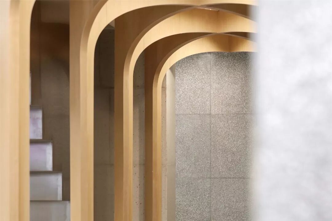 ▲拱的要素既是覆盖,也是限定。在二楼,镂空的拱朝着不同的方向铺开,重重幕幕,空间像被拉开了几个层次;层层叠叠,又好似无尽。纺布是时装的展场。女朋友说,温和的曲率,柔软的包裹配上鲜花甜点,窝在这里美美的喝上一番下午茶的欲望都有了。