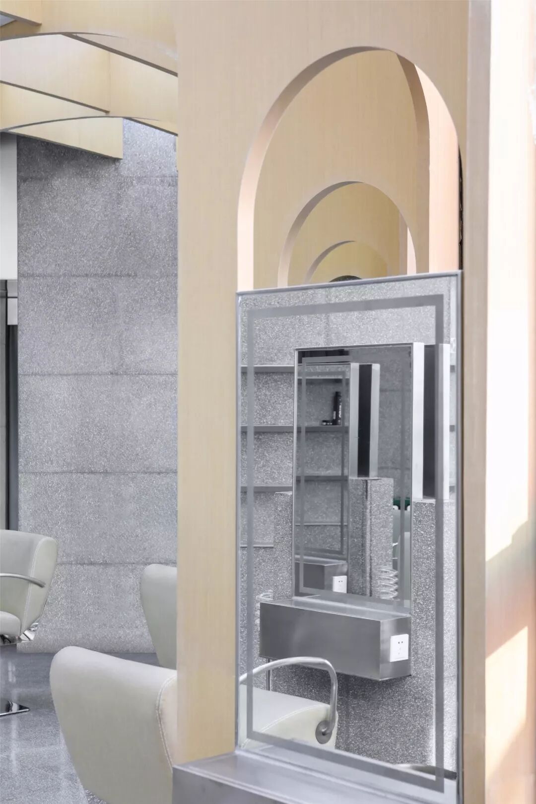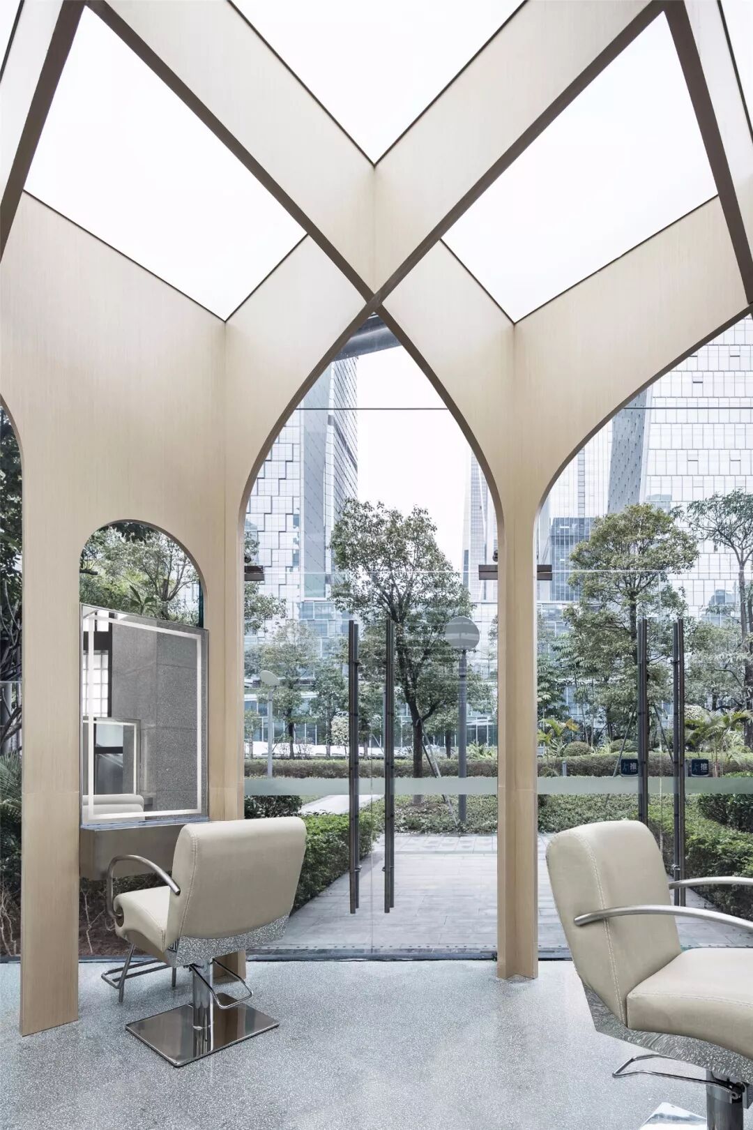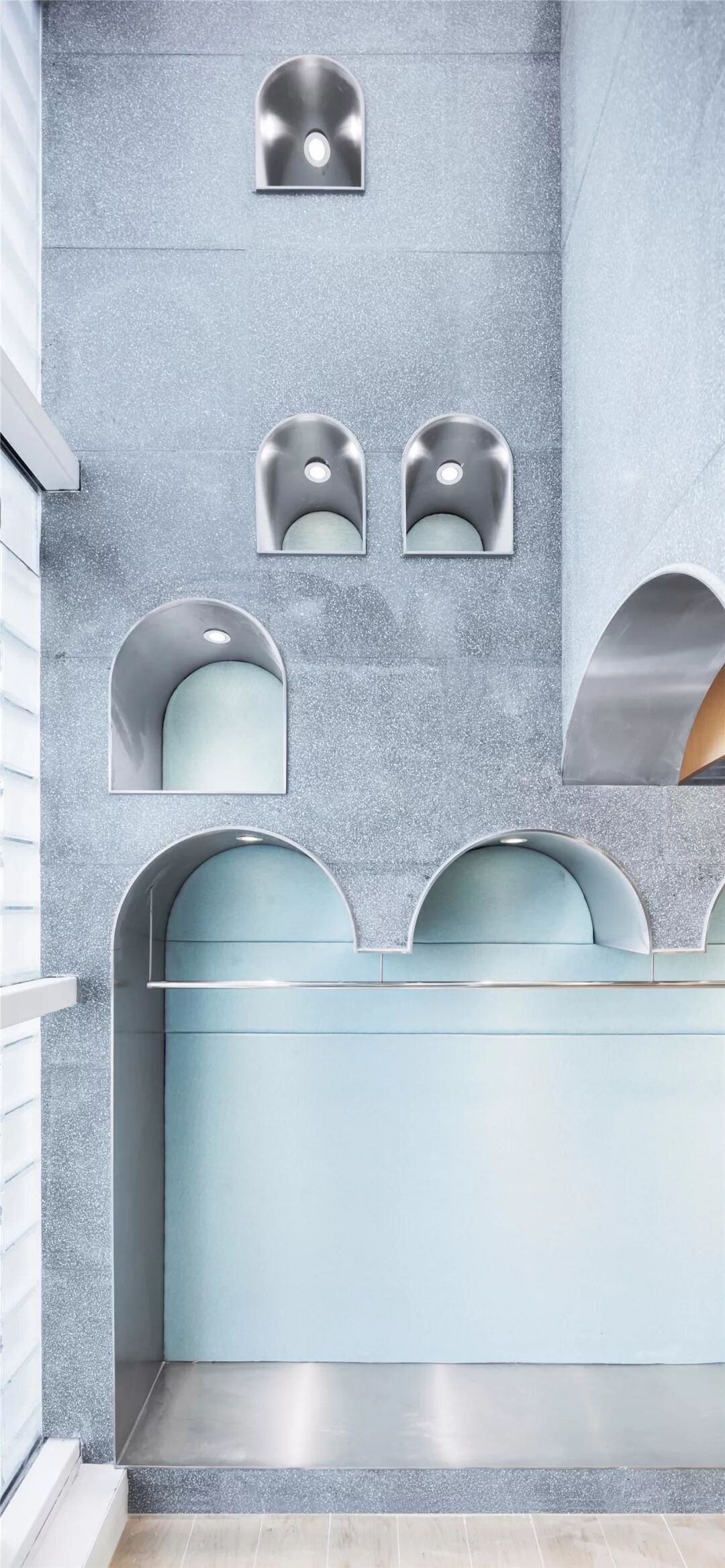 ▲拱的要素既是覆盖,也是限定。在二楼,镂空的拱朝着不同的方向铺开,重重幕幕,空间像被拉开了几个层次;层层叠叠,又好似无尽。纺布是时装的展场。女朋友说,温和的曲率,柔软的包裹配上鲜花甜点,窝在这里美美的喝上一番下午茶的欲望都有了。
