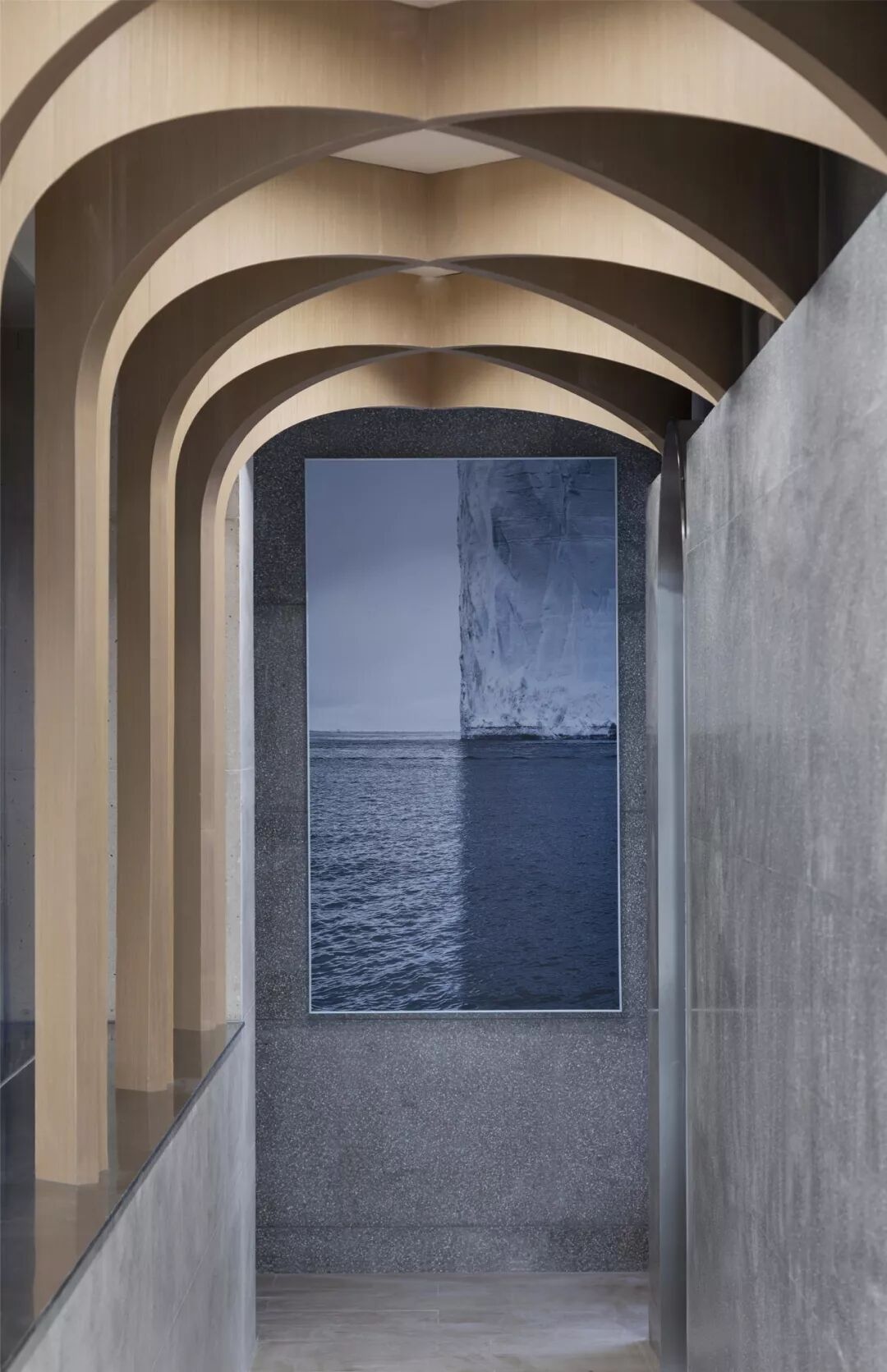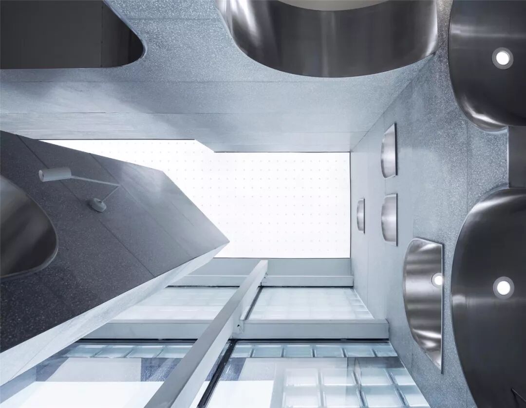▲一层空间像一个浸入式的剧场,水磨石包裹的地面和墙体沉稳厚重,自成一体,让你有种向上仰望的欲望,一片天幕。它像覆盖着舞台的穹顶,微微隆起,轻轻接触,一冷一暖像在对话。