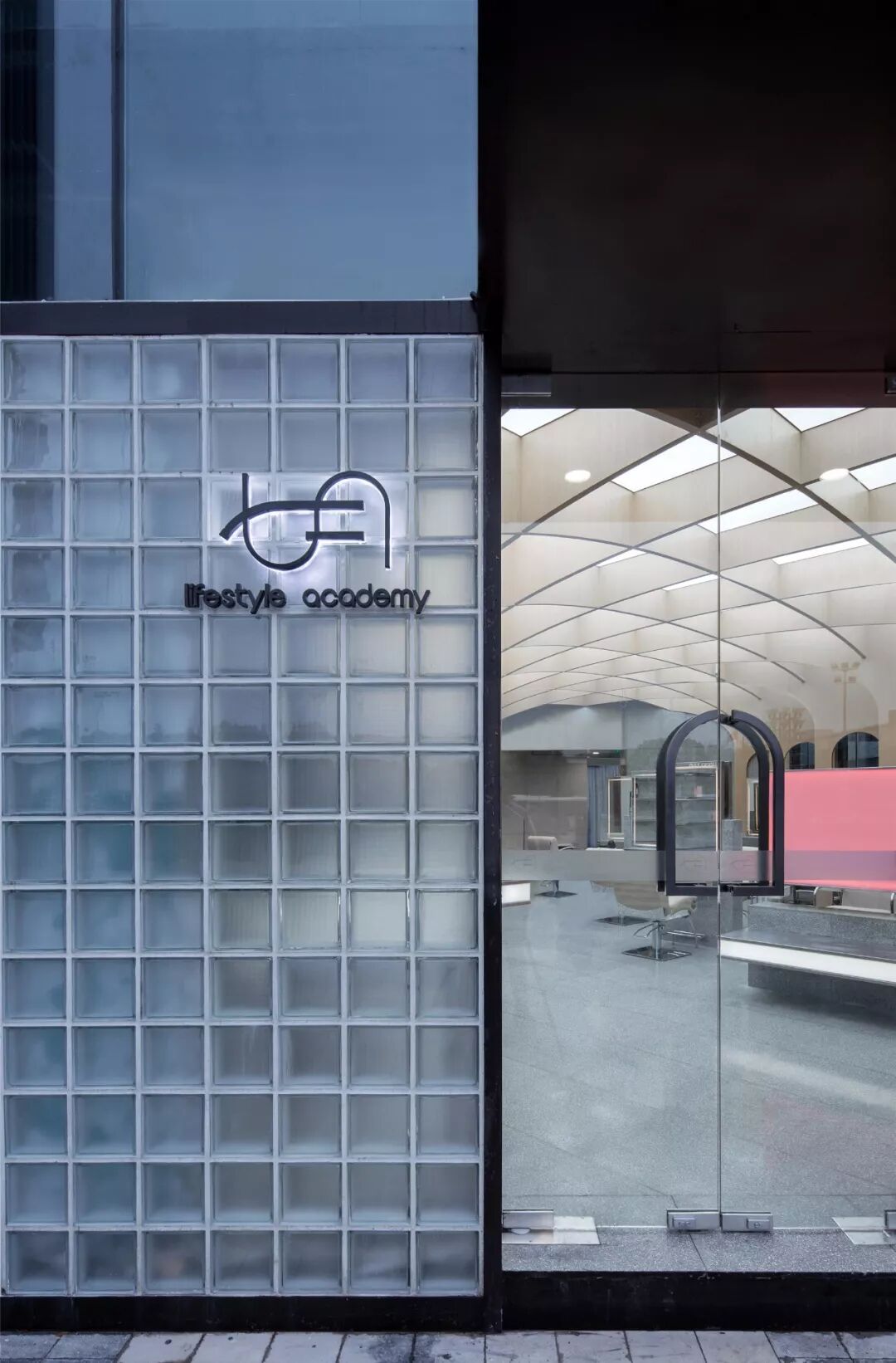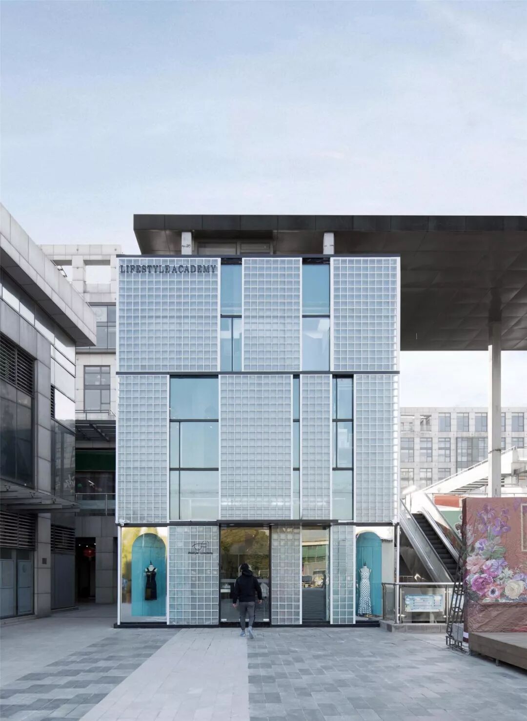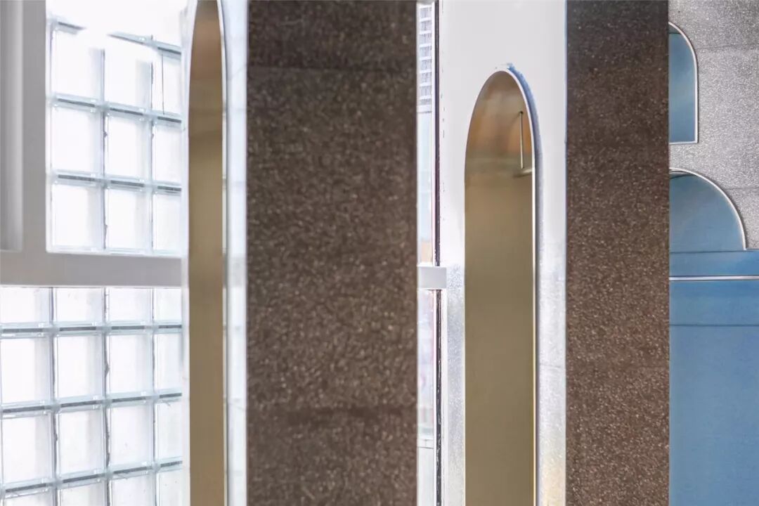 ▲空间的表情庄重有序,又可爱的一撩,露出两个小角,是一层的橱窗。反射着天光云影,坚硬的玻璃砖呈现出帷幕般的柔软肌理。平静之下,暗藏一段空间拼贴的叙事和戏剧性的冲突。