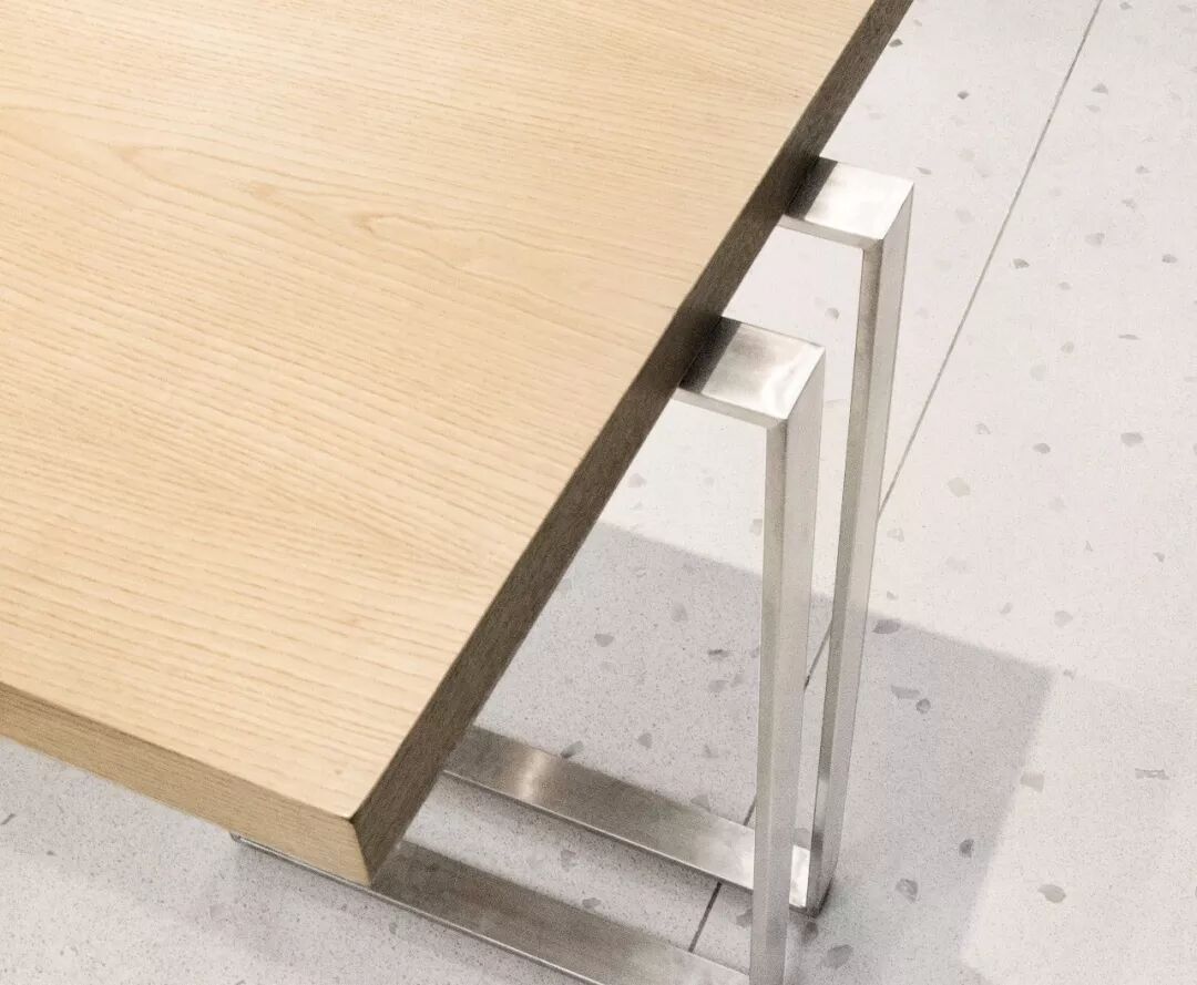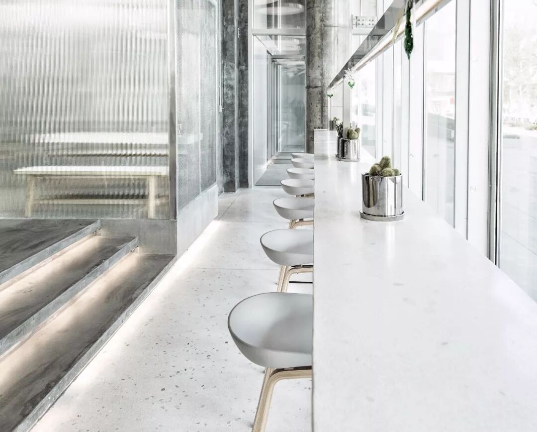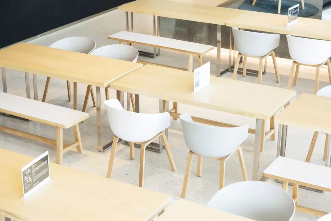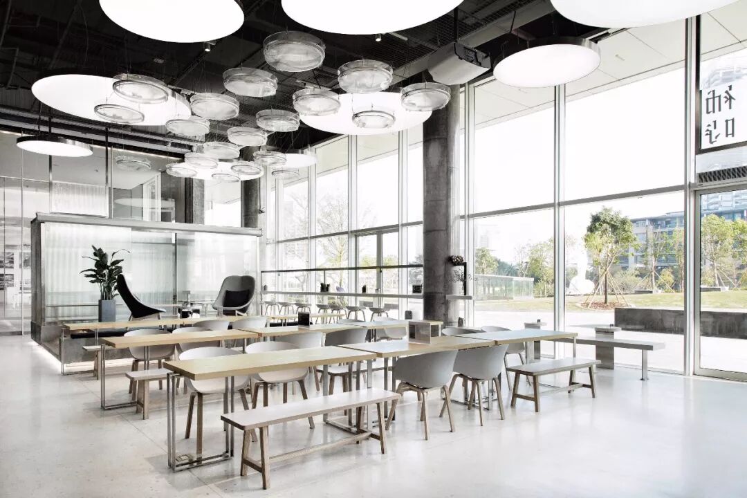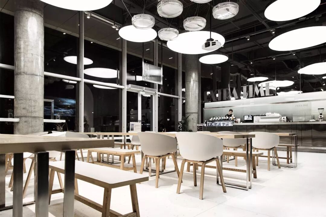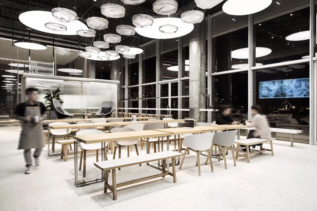 ▲XU Studio为補時海上文化中心店特别定制了Frame系列餐桌,概念来源于用最简单的金属框架支撑木桌面,通过左右5cm的错位,自然形成间隔互不干扰,又在需要时可以链接成大长桌。