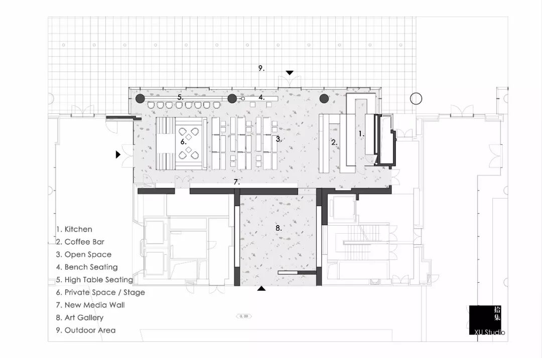 ▲项目平面呈凸字形排布,我们选择沿户外靠近海岸的长条空间作为咖啡及知识分享区,凸出的方形作为艺术空间,链接海上文化中心中庭。顾客由建筑中庭进入纯白的艺术空间,户外自然光透过高而窄的弧形门洞指引顾客前往探索,穿过门洞,挑高6米的全落地窗大空间跃然眼前。