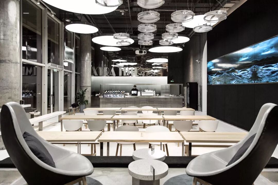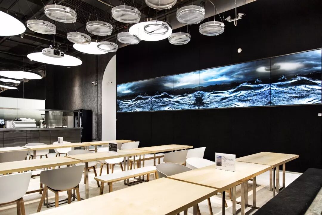 ▲区别于传统咖啡店的慵懒背景音乐,我们能听到时而磅礴时而细密的海浪声,来自于空中悬挂的艺术家作品“海浪”,这是一件通过采集世界各个海域海浪声以钢珠晃动碰撞呈现的新媒体艺术装置。侧墙面则有大型LED屏幕同步播放海域音响,给人视觉听觉的双重撞击。