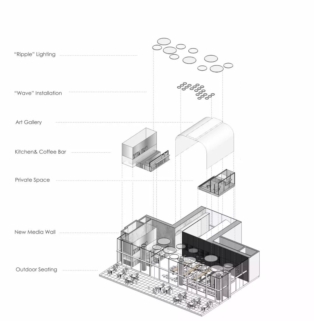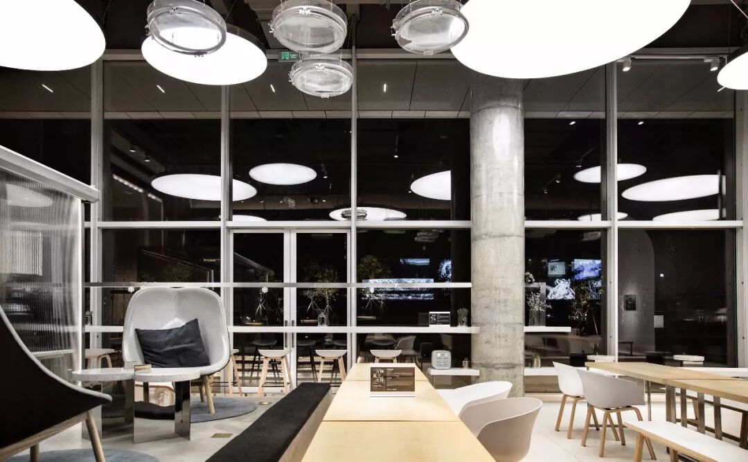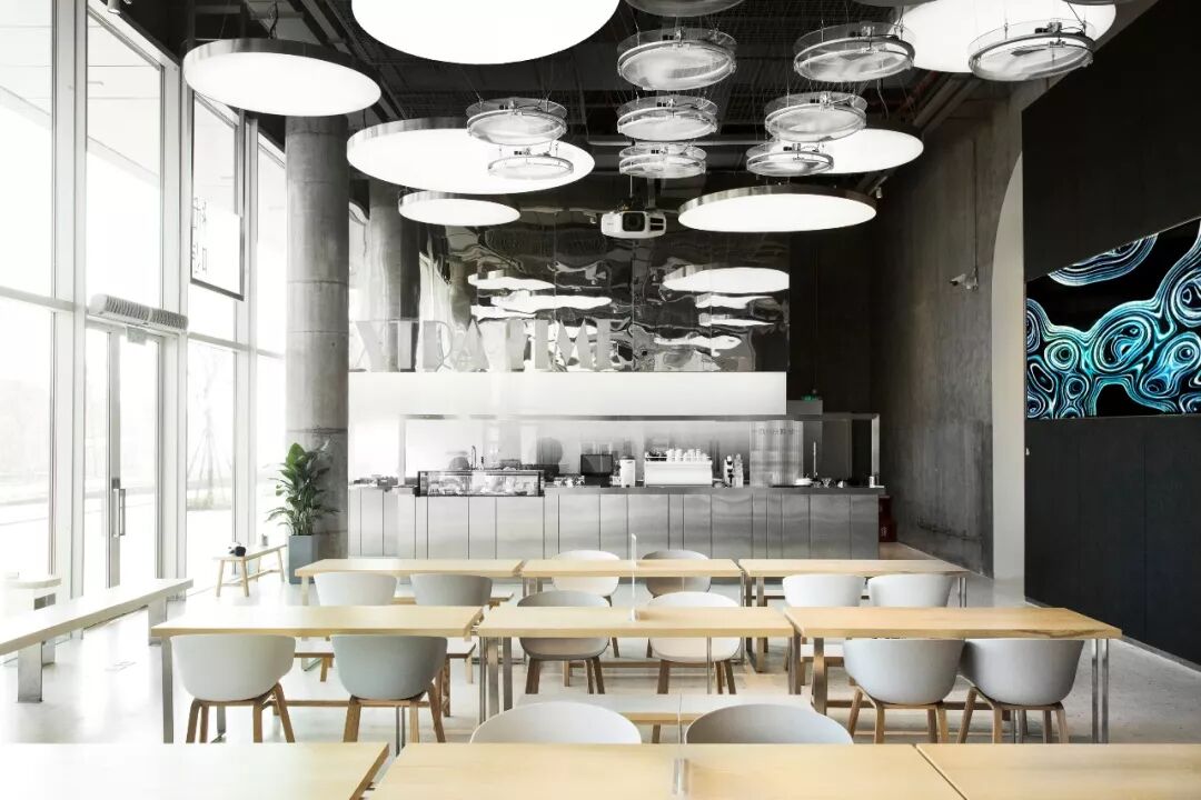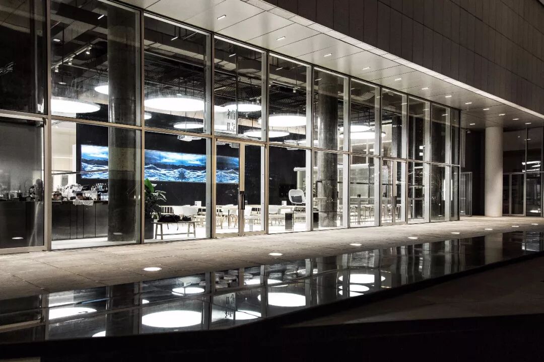 ▲空中悬浮着10个巨大发光圆盘,灵感来自于设计师儿时的记忆,坐在窗边看雨水打在水塘中泛起的层层涟漪,因时间的推移呈现出大小不一的圆圈,意图抓住这个瞬间与大家分享。夜色中,落地窗后的悬浮发光灯盘格外醒目,倒映在户外静水池中。