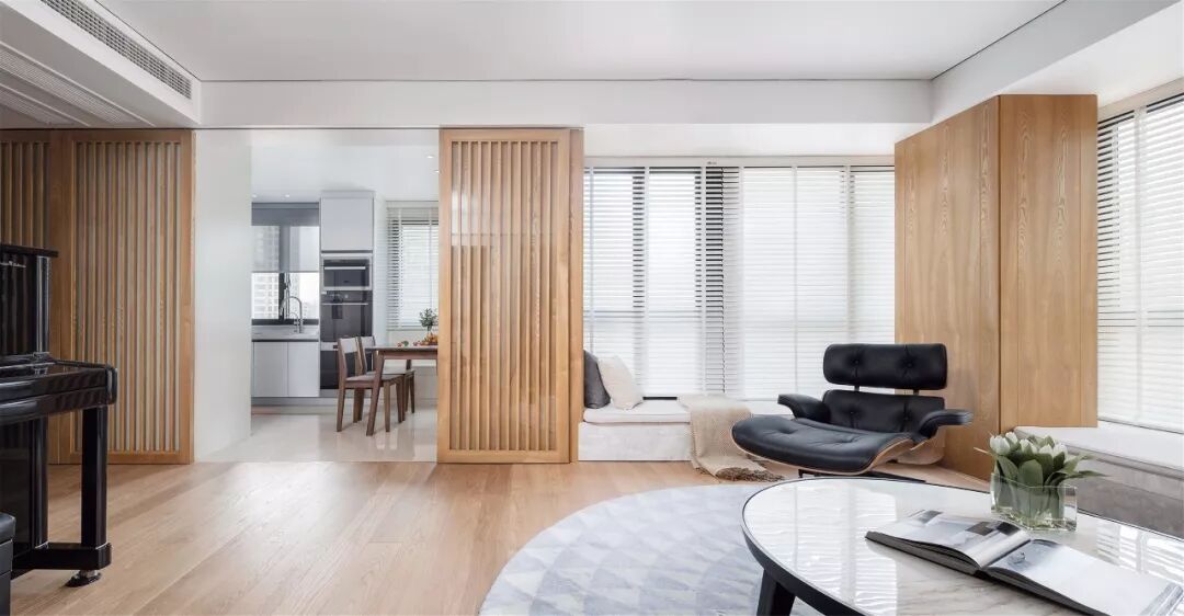 一整片落地玻璃窗,及边上一排的飘窗代替了客厅昂贵的大沙发。