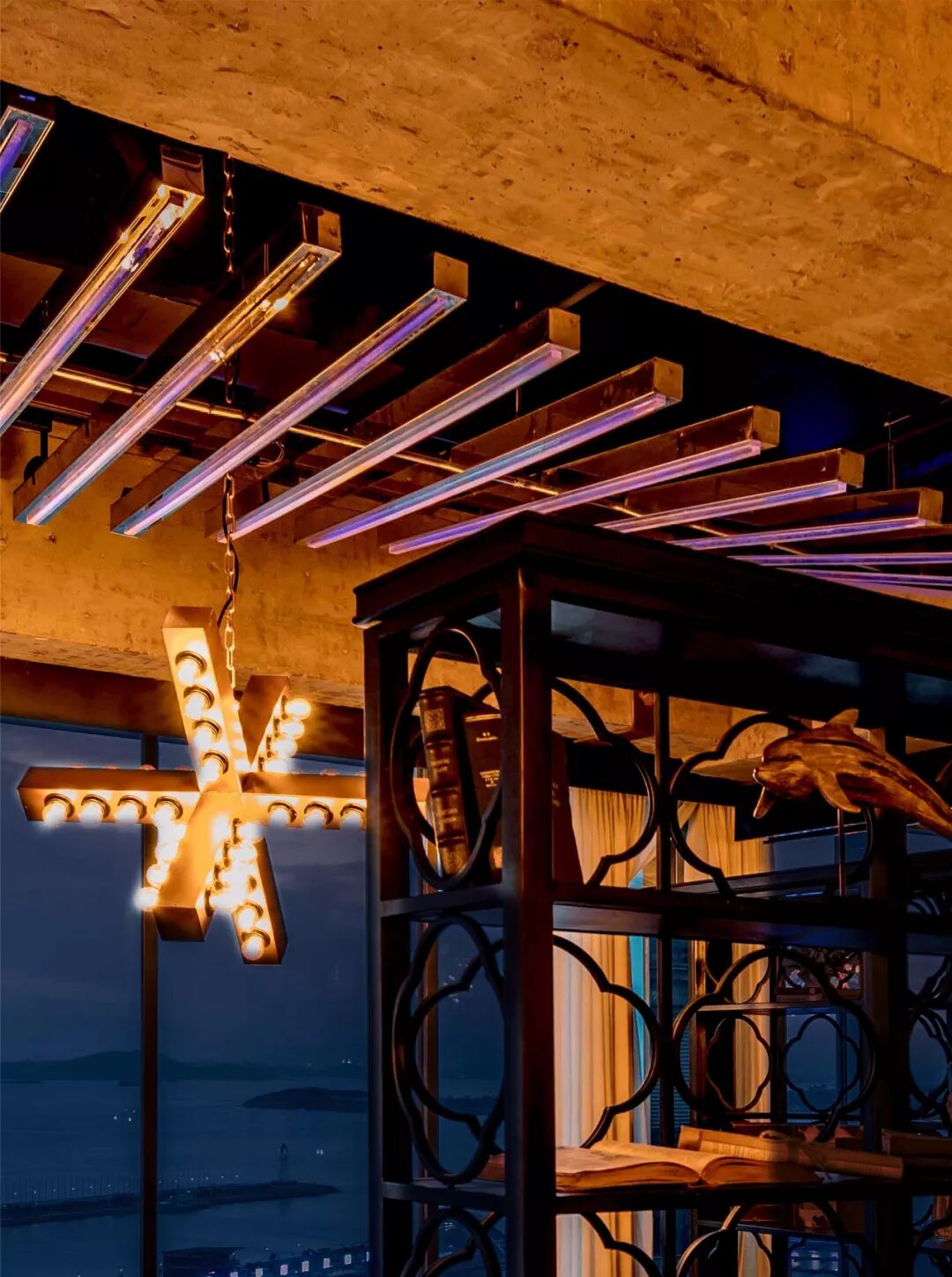 ▲配合以水泥墙面、牡蛎壳造型墙面的质感,呈现细腻与粗狂的碰撞。家具灯具多以海洋文化、港口文化的元素进行提炼改造,让用餐者潜移默化的感受到青岛的本土风情。