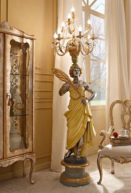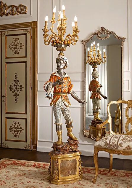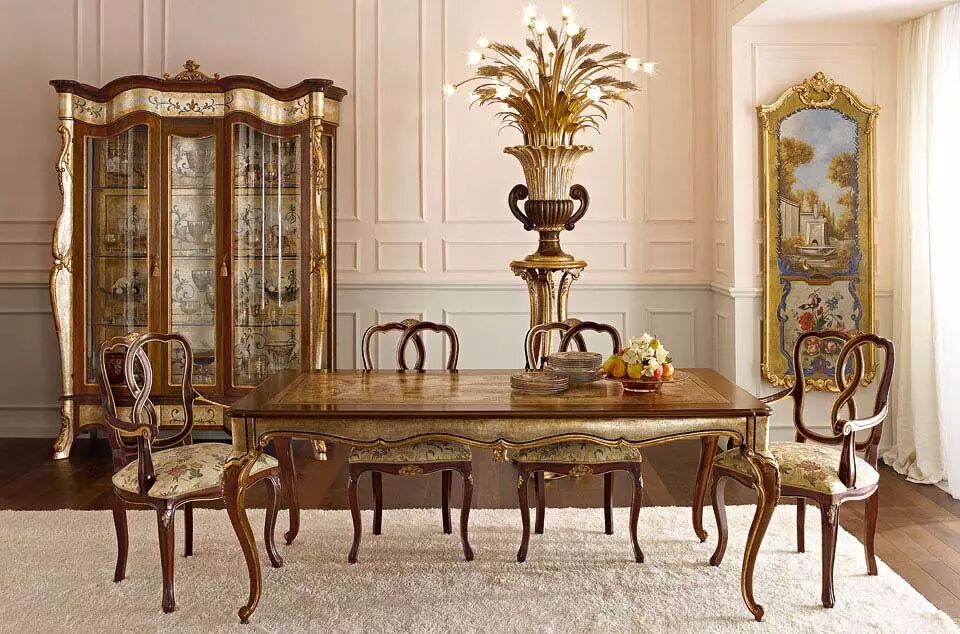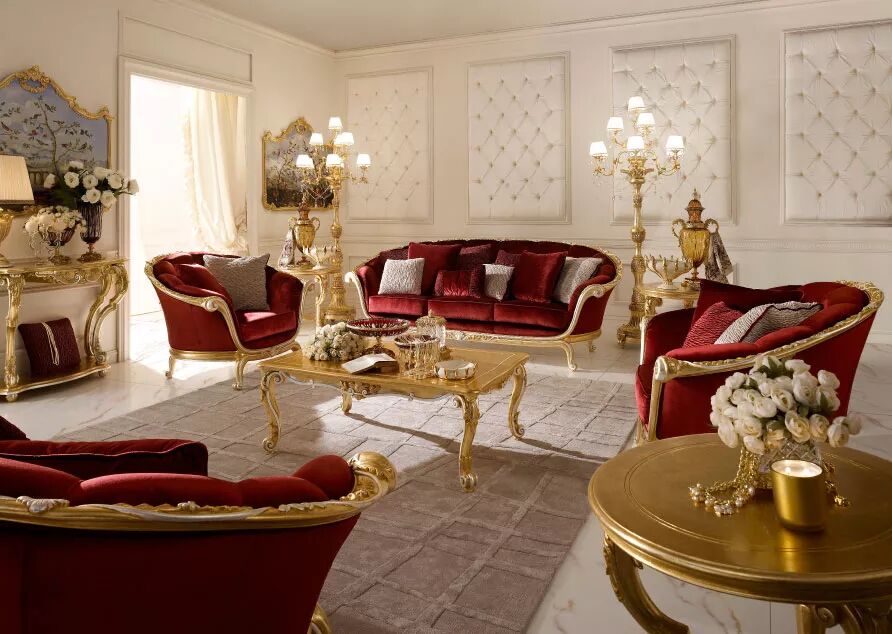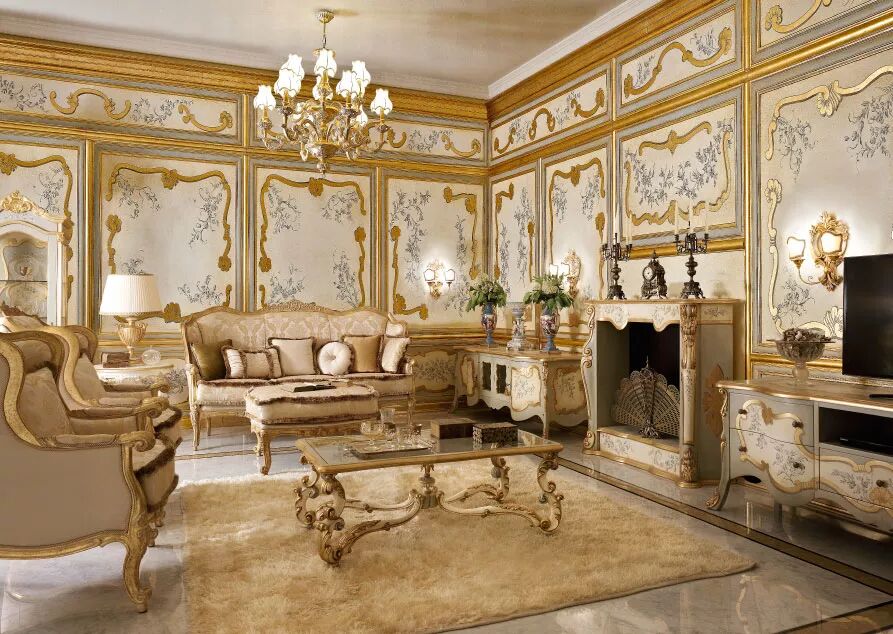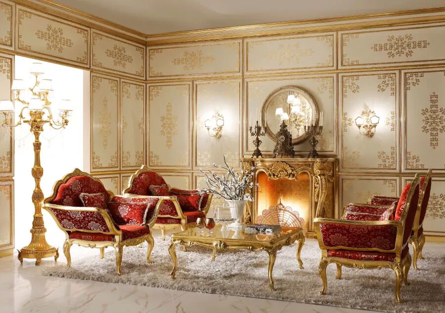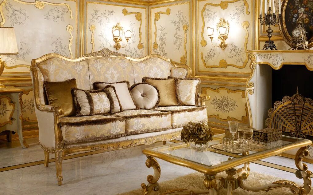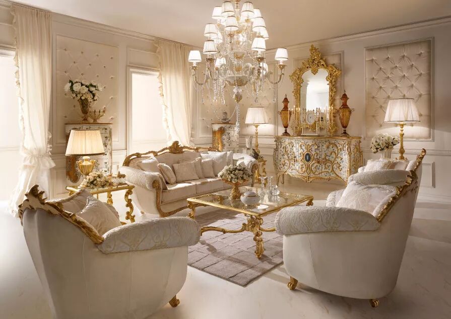 客厅是家中最重要的空间,这里是家人一起放松休息的地方,ANDREA FANFANI雕刻精美的木制沙发、小雕像形式的落地灯和用精美镀金图案装饰的镜框让您的家多了一分豪华。