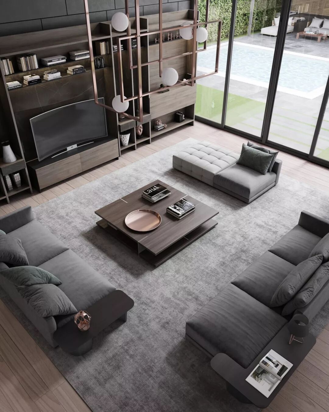 客厅中央颇有设计感的吊灯装饰,金属质感为高级灰的室内陈设增加亮点。