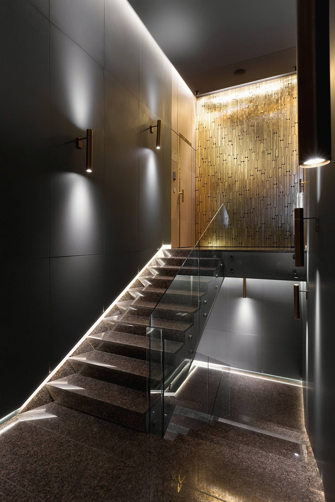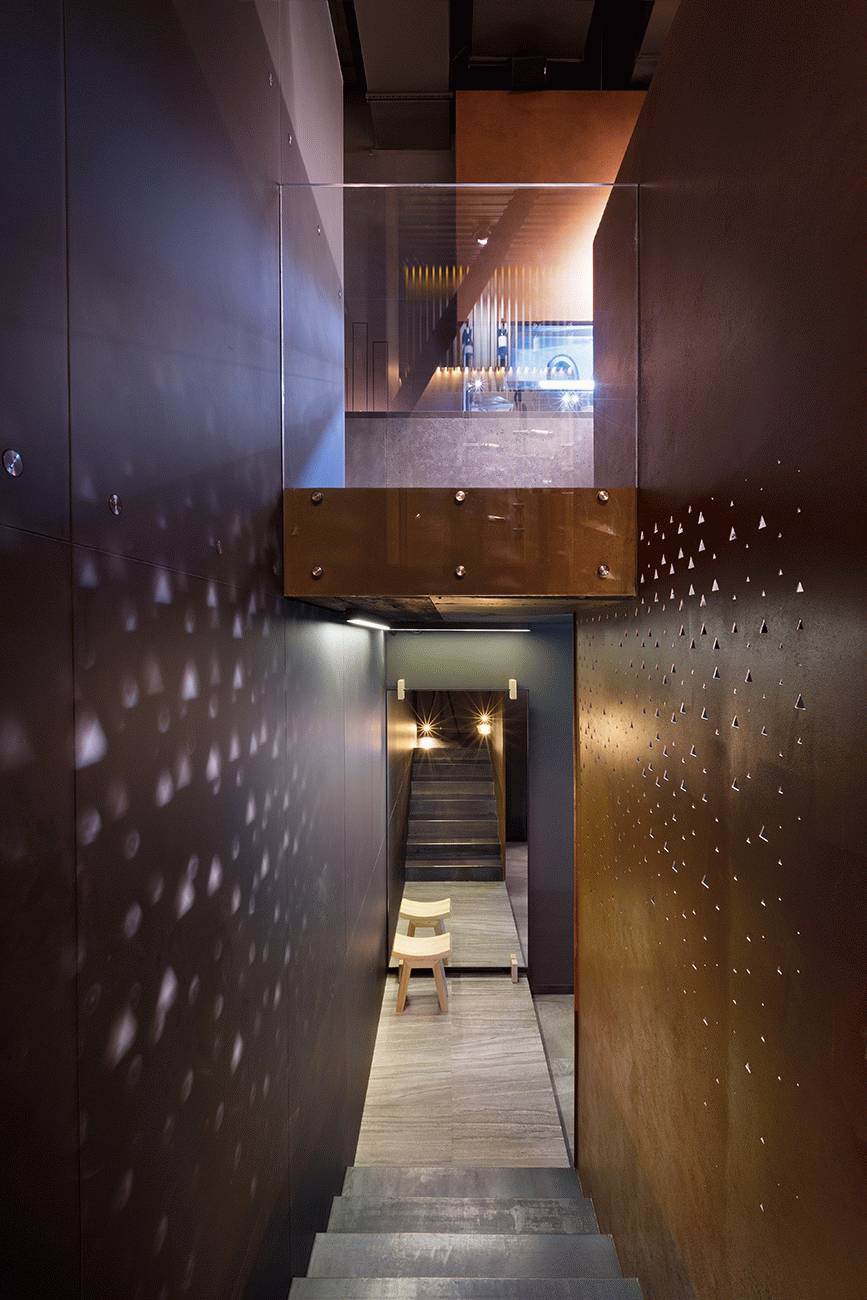 楼梯两边的金属墙面,被设计凿出大大小小的孔,不但可以透光,对面墙壁的投影更有意境,也打破了沉闷感。