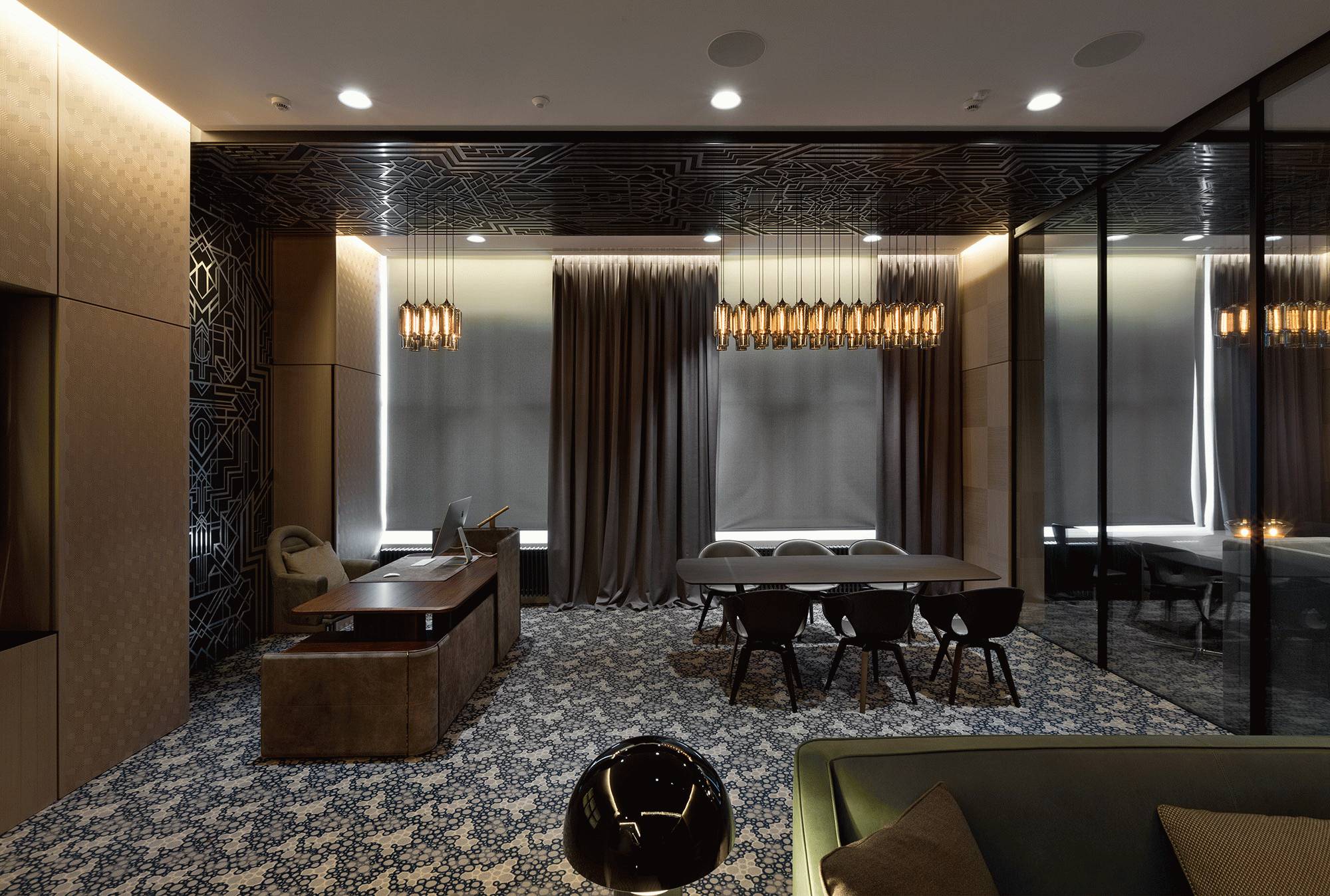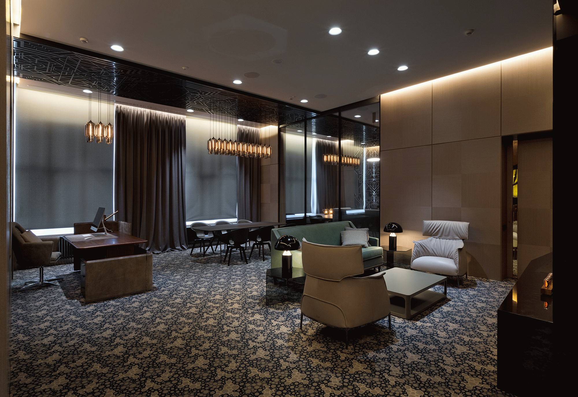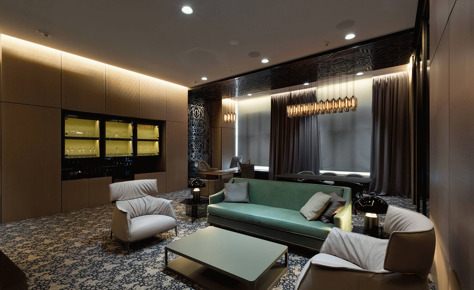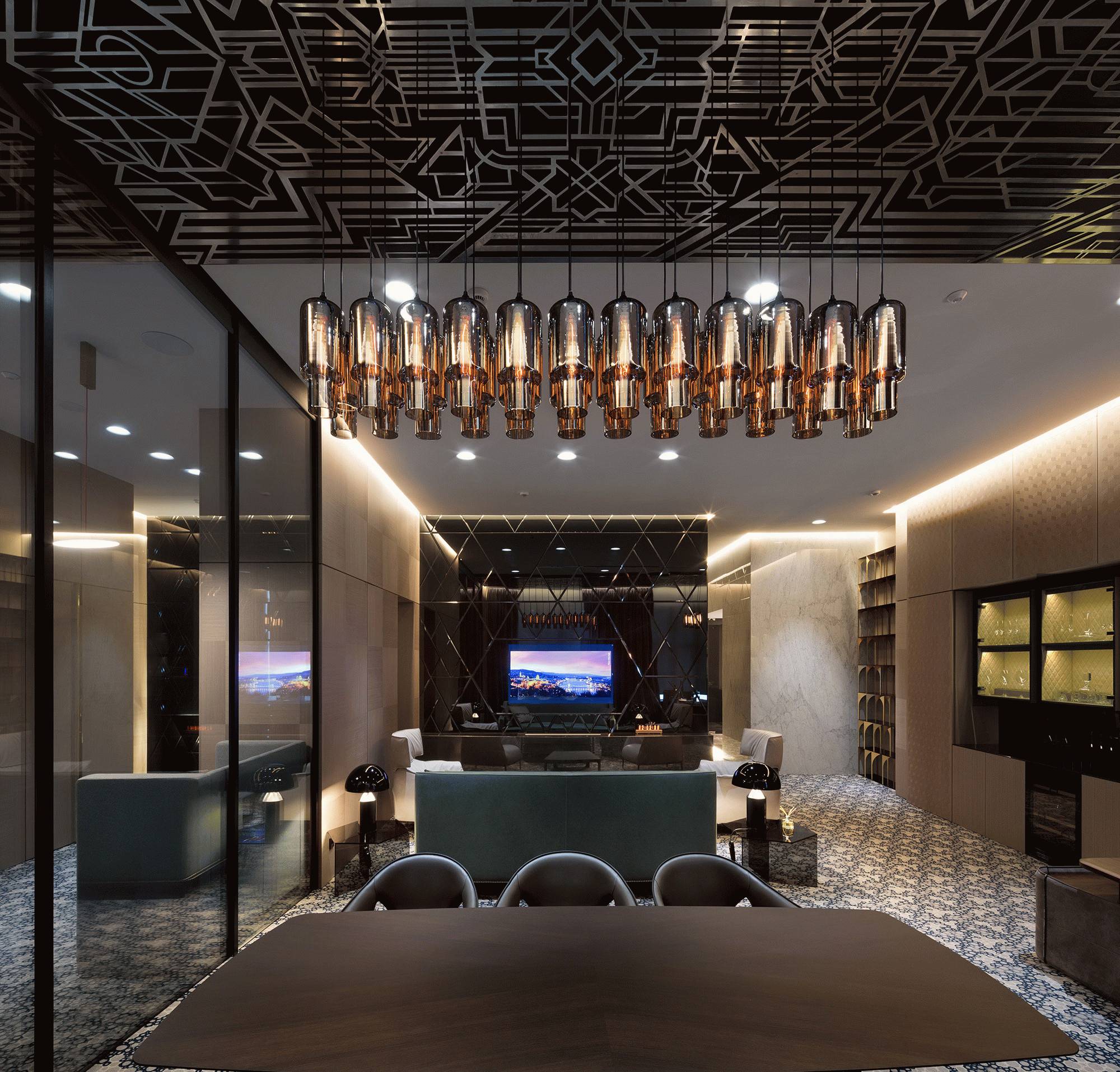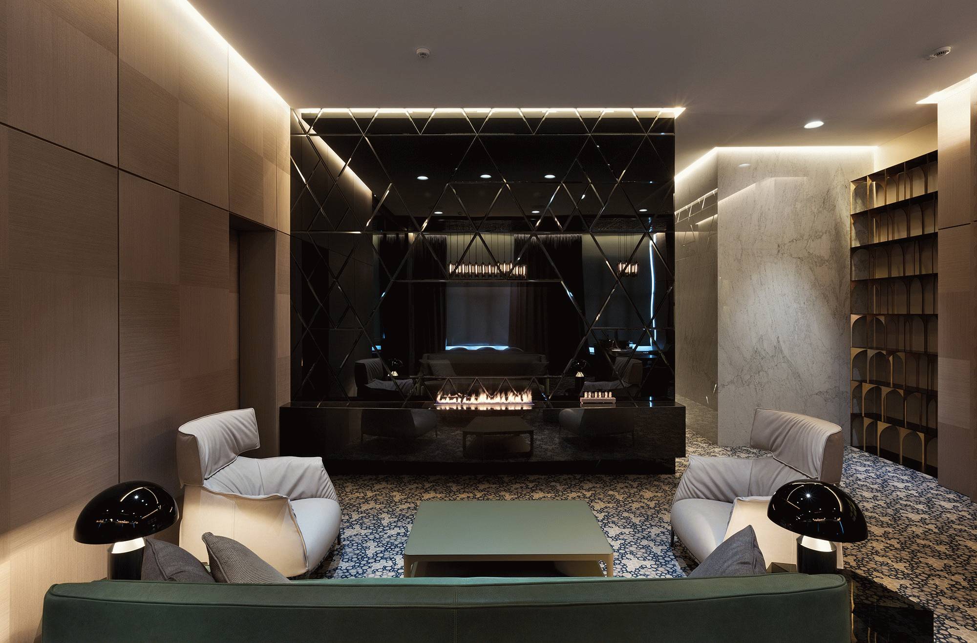 家具和灯具全部采用意大利顶级品牌,颜色搭配沉稳大气,黑色几何图案的运用让室内有着前卫和时尚的气息。