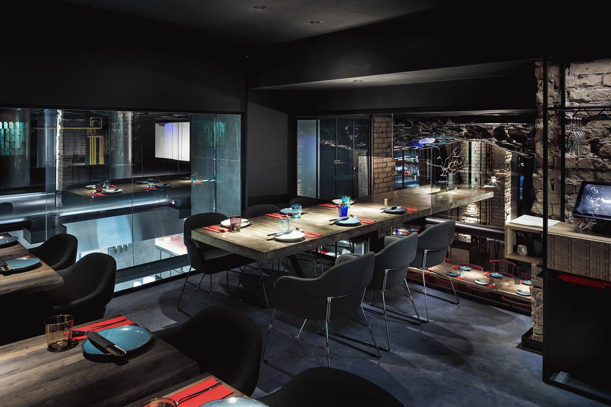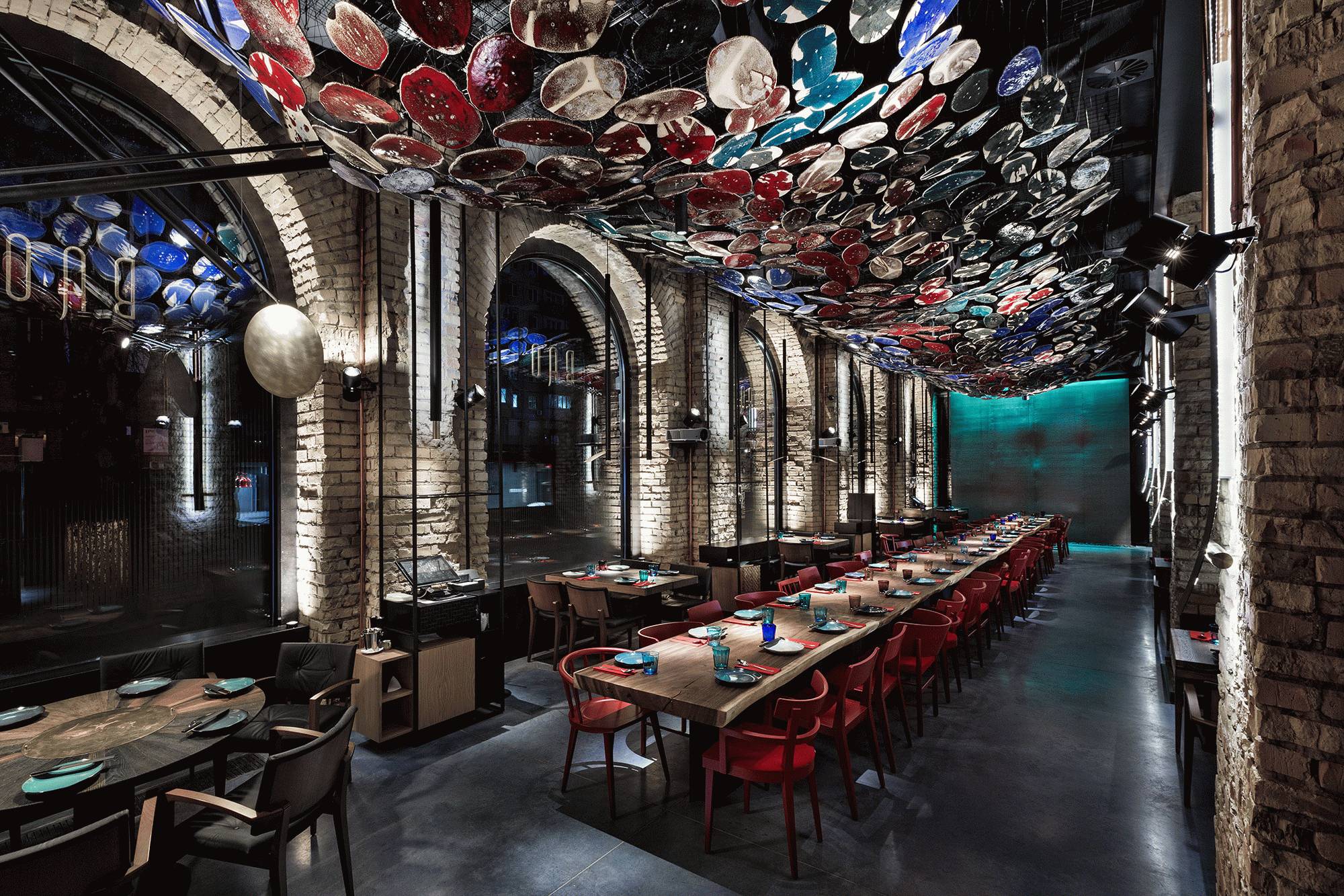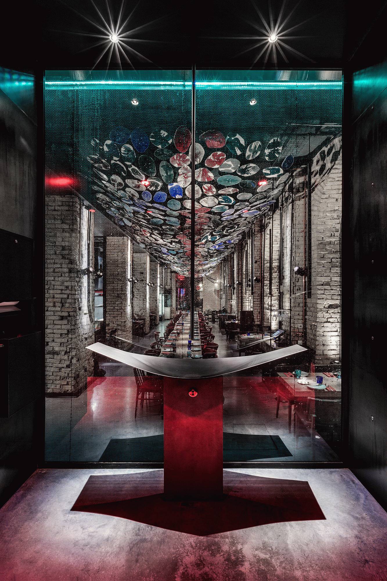 裸露的墙面、红色的灯光。气氛营造很舒适,主餐区有一张长桌,可以同时容纳50位客人用餐,桌面六黄铜吉祥物互联,充满了东方哲学的符号,在桌子上方的天花板上,可以看到空间的主要装饰元素 - 鲤鱼跃龙门。蓝色与红色的瓷砖组成,每一个红色都象征着锦鲤。