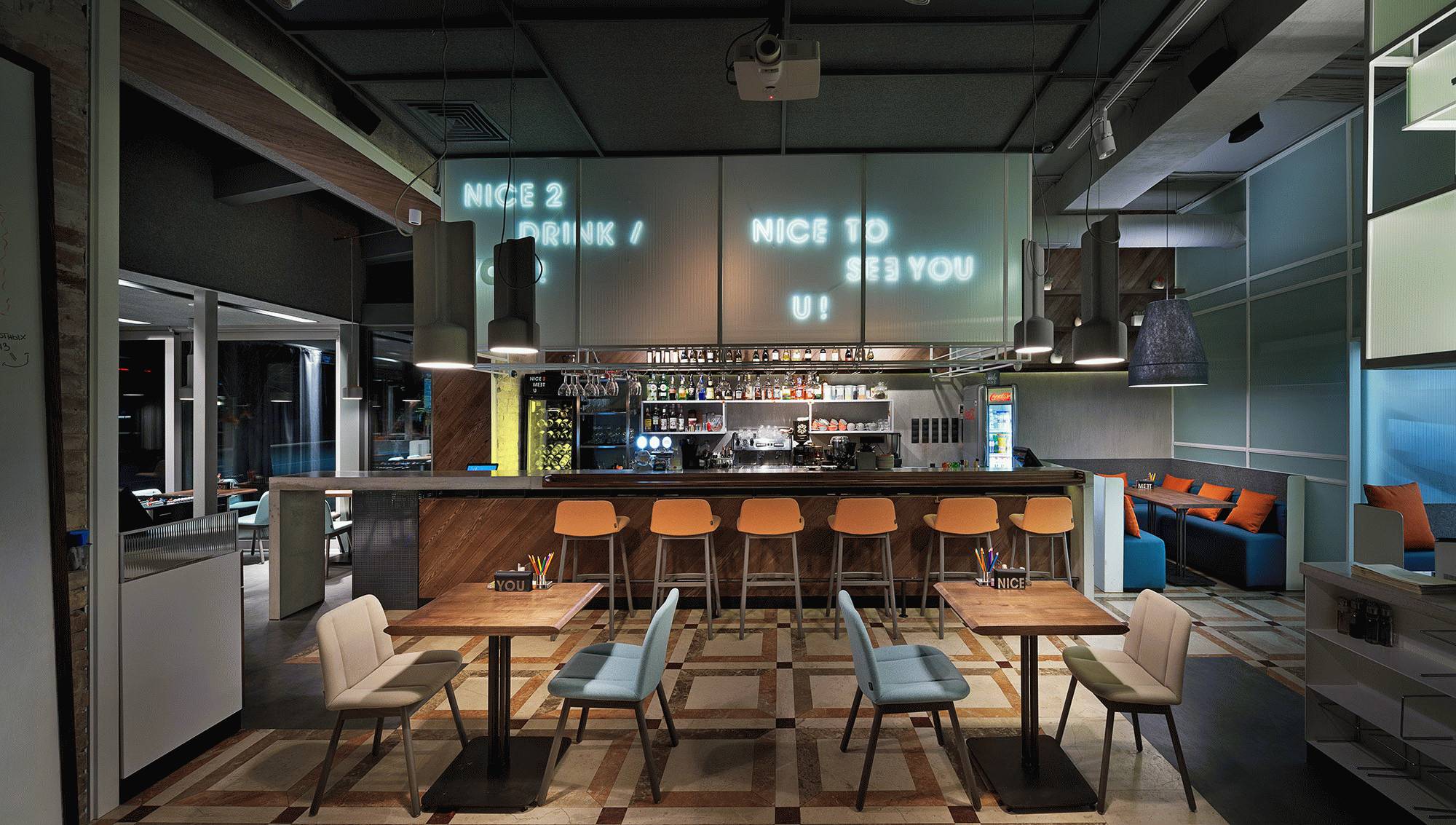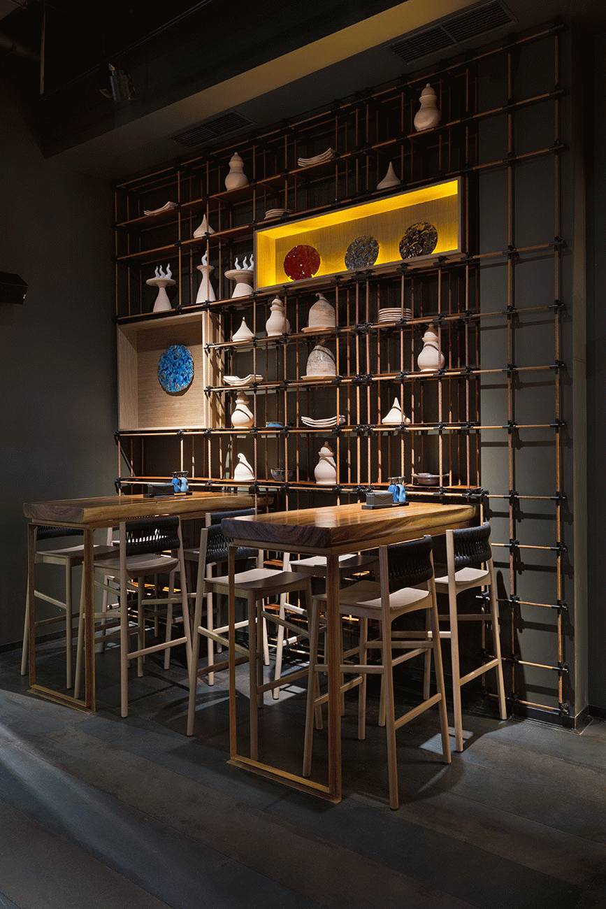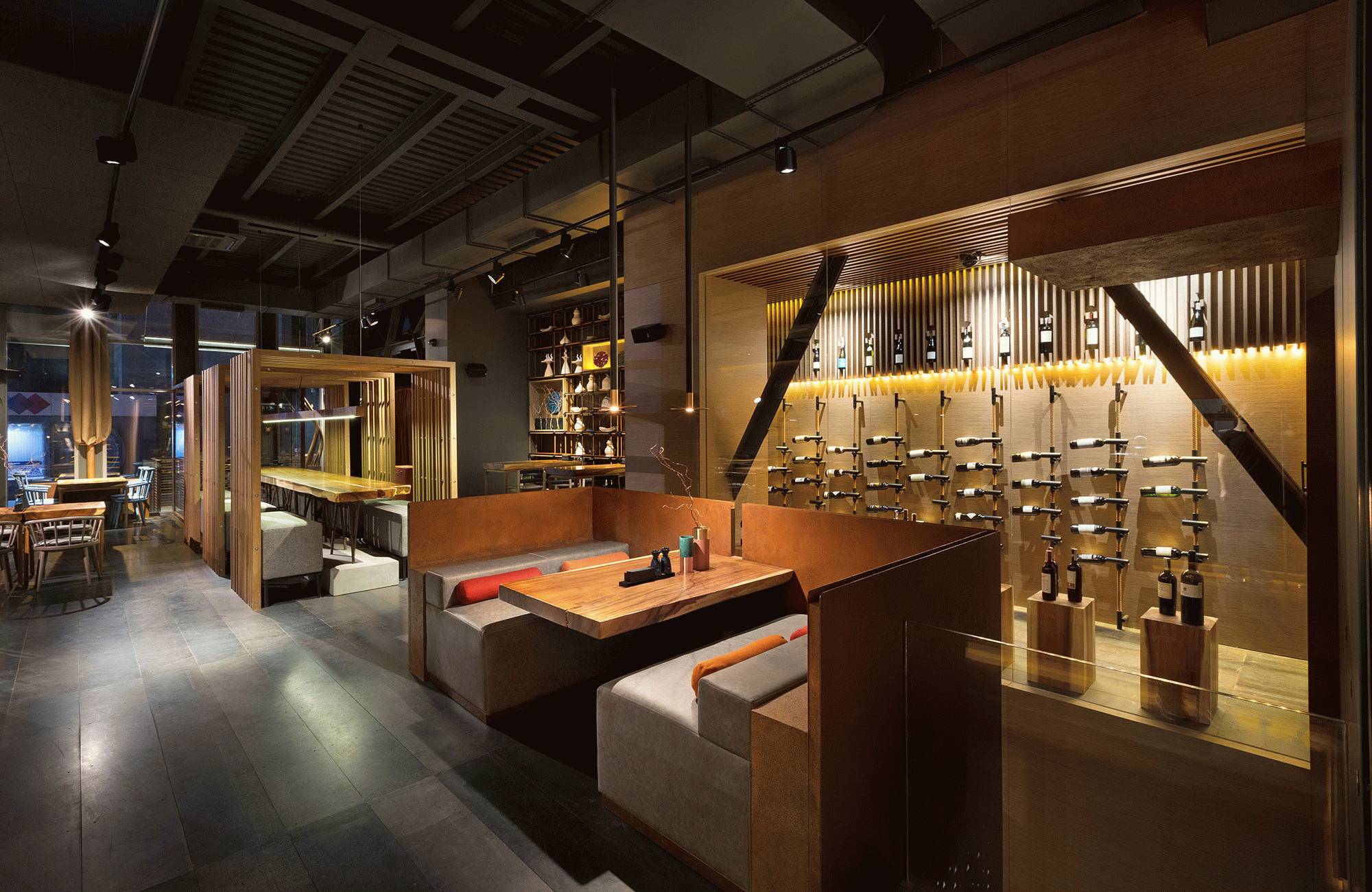 裸露的墙面、红色的灯光。气氛营造很舒适,主餐区有一张长桌,可以同时容纳50位客人用餐,桌面六黄铜吉祥物互联,充满了东方哲学的符号,在桌子上方的天花板上,可以看到空间的主要装饰元素 - 鲤鱼跃龙门。蓝色与红色的瓷砖组成,每一个红色都象征着锦鲤。