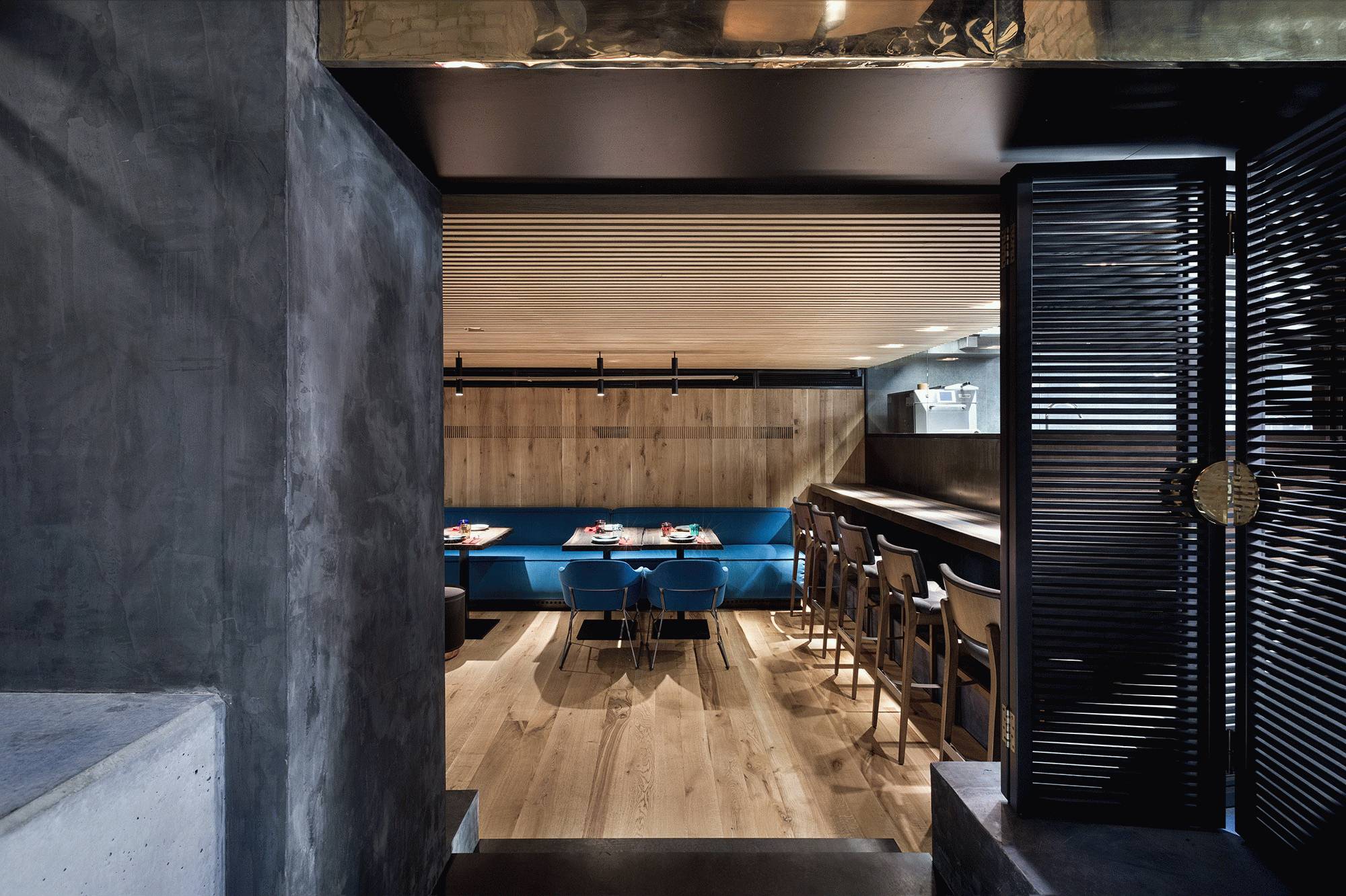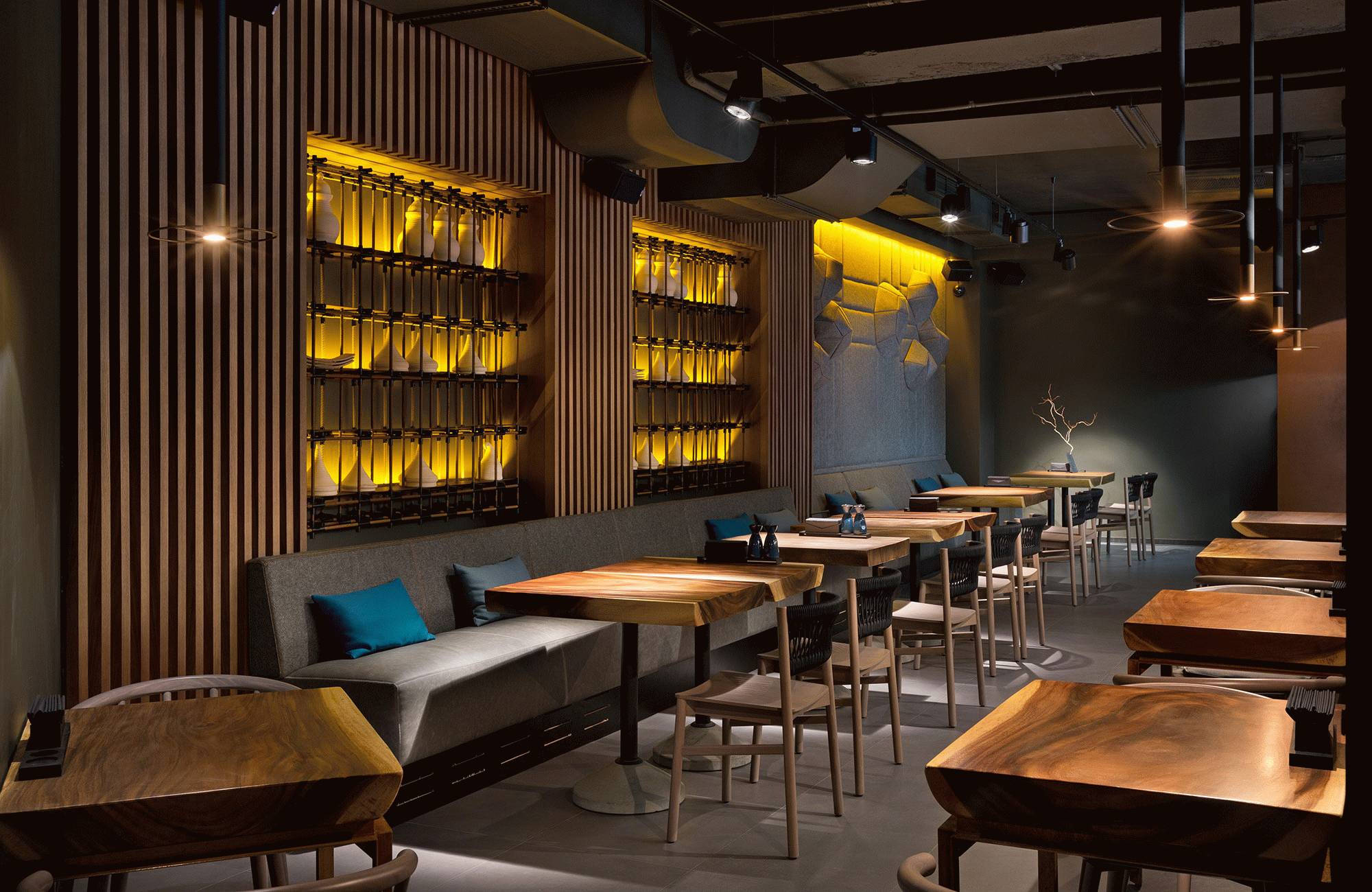 East餐厅位于基辅的历史中心街区,设计师运用一些东方表现手法,把石材,木材,金属,水和火这些元素糅合在一起,营造一种安静优雅的感觉。