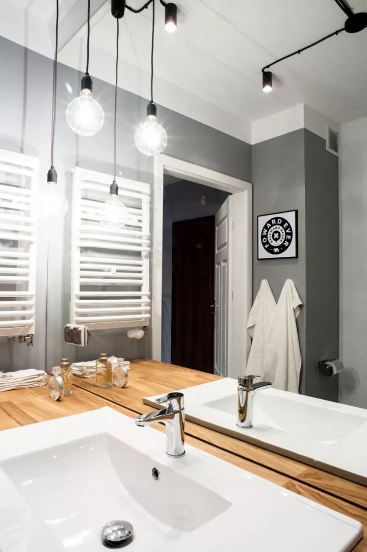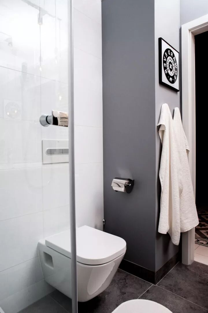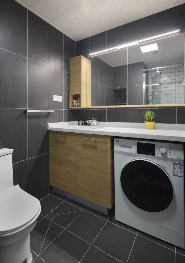 灰色的墙面,让卫生间拥有简约的质感。镜面覆盖浴室柜上方的整面墙,让小空间看起来更宽阔明亮。