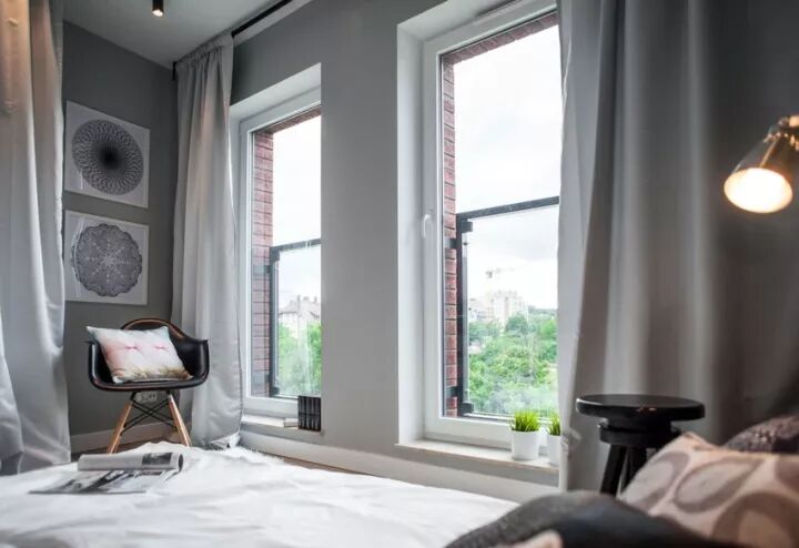 卧室拥有两扇明亮的落地窗,室内采光充沛,室外一片绿意,于角落布置一片休闲区,既能观景,又能享受日光浴。